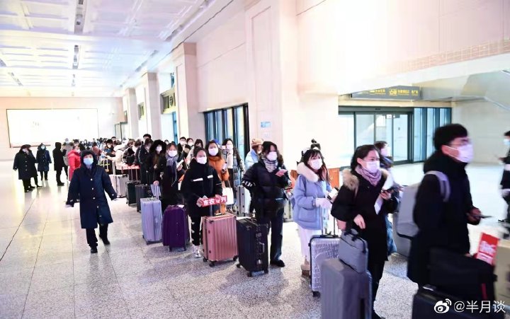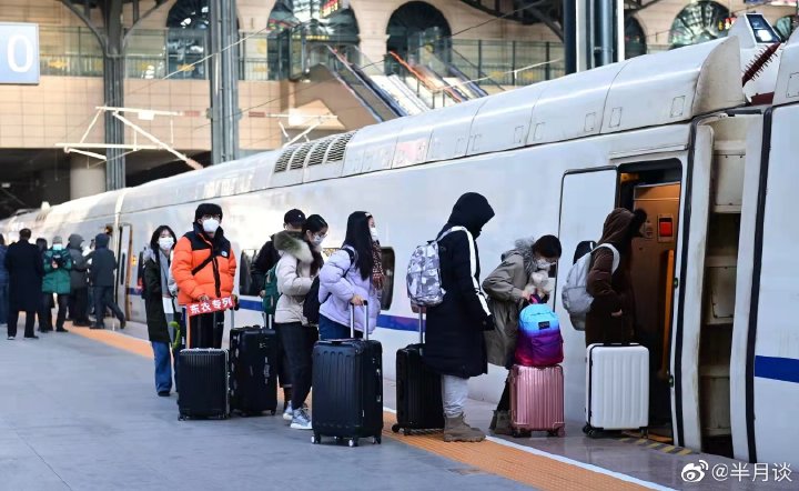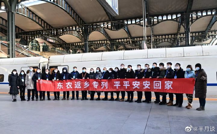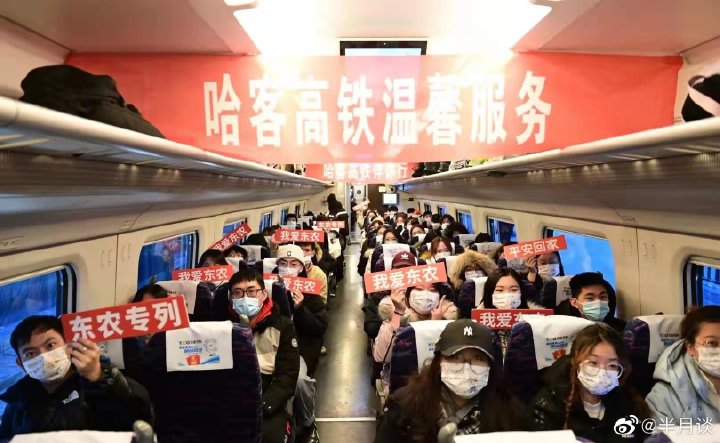 【#高校“包火车”助学生返乡#】12月24日,东北农业大学400多名学子乘坐专列踏上返乡旅程,这是中国铁路哈尔滨局集团有限公司今年开行的首趟学生返乡高铁专列,从哈尔滨开往齐齐哈尔。为在常态化疫情防控下,尽可能保证学生安全,学生享受到“从校门到车站”“从车站到家乡”的无缝对接服务,铁路部门还为其他返乡方向的学生提供“包车厢”服务。(记者王君宝)