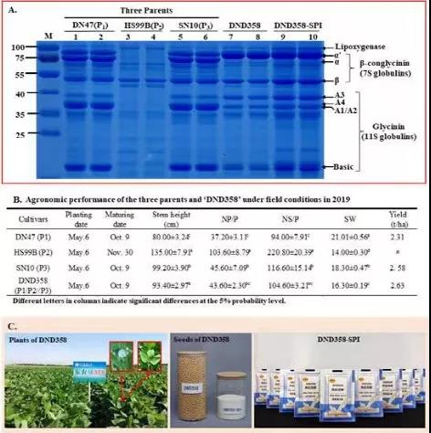 刘珊珊/张淑珍教授课题组,历经十六年的努力,创制了世界上首个具有中国大豆遗传背景的、‘降胆固醇特殊健康用途’大豆新品种:‘东农豆358’。课题组以亚基组成正常型‘东农47’、‘绥农10’及多亚基缺失稀有育种材料‘HS99B’为亲本,采用‘东农47/HS99B//绥农10’配组方式,通过三系三交法,成功将大豆7S球蛋白α亚基,11S球蛋白G1 (A1aB2), G2 (A2B1a)和G4 (A5A4B3)亚基隐性缺失基因导入中国大豆遗传背景,育成同时缺失α/G1/G2/G4四亚基、基因型为‘cgy-2/gy1/gy2/gy4’的‘四缺’突变品种。多亚基缺失导致‘东农豆358’的精氨酸含量大幅提高,α′亚基大量富集。