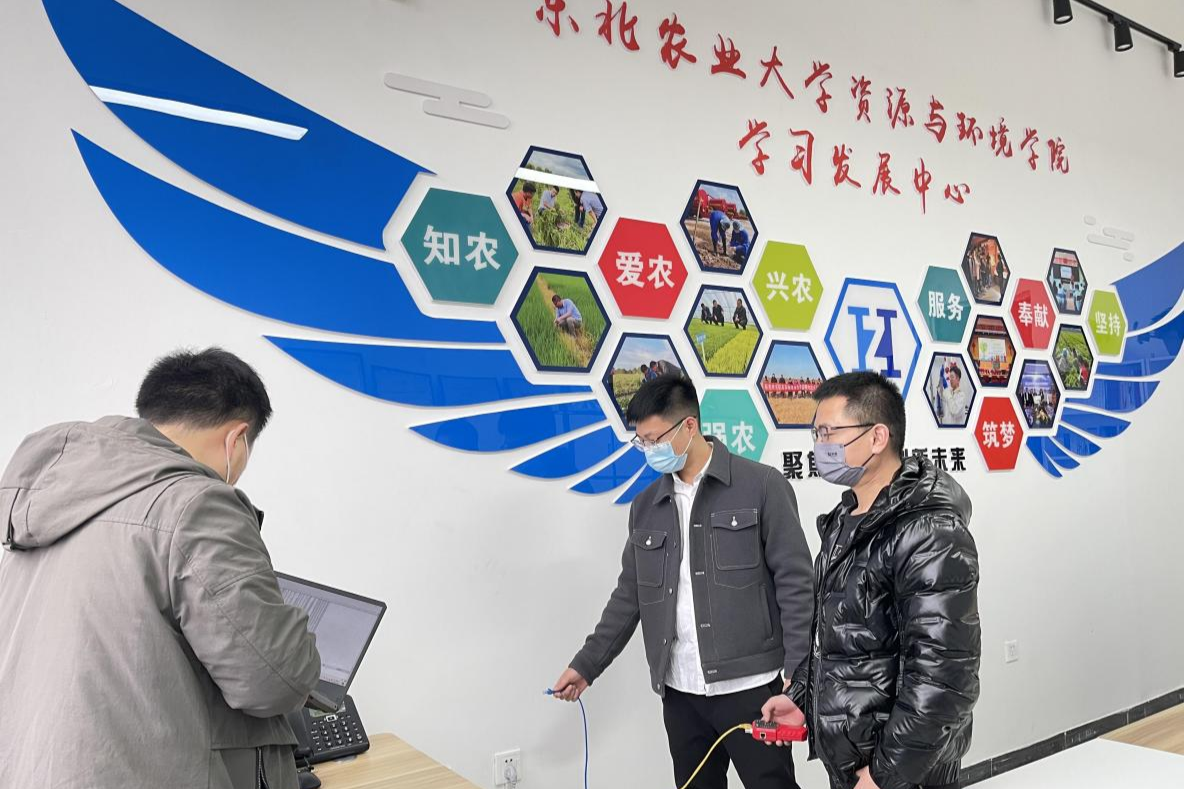 资源与环境学院老师为复试场地铺设网线(央广网发 东北农大 供图)