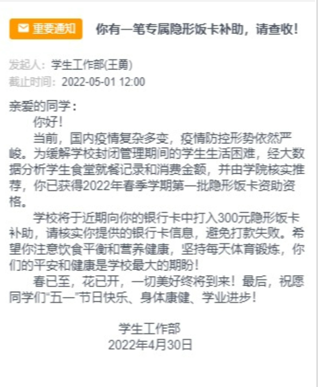 本次“隐形补助”发放过程中,学校通过比对学生校园卡食堂消费记录,发现有335名学生每餐消费标准远低于全校学生平均水平。同时,学校通过各学院辅导员对以上学生情况进行摸排,确认多为受疫情影响较大的家庭经济困难学生。本次关爱经济困难学生工作,学校决定向335名学生发放总额10.05万元的春季学期第一批“隐形饭卡补助”,近期每人300元的用餐补助将打入受助学生的银行卡中。