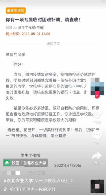 对个别因毕业实习滞留在上海市、长春市中高风险地区的家庭经济困难学生,由辅导员统计相关信息后,学校给予每人500-1000元不等的临时困难补助。并通过“今日校园”发送慰问信息,嘱咐学生做好自我防护的同时,积极配合当地政府做好疫情防控工作。一句“你永远是学校最深的牵挂,你的平安和健康是学校最大的期盼”,让因实习滞留在中高风险地区的毕业生感到内心温暖。