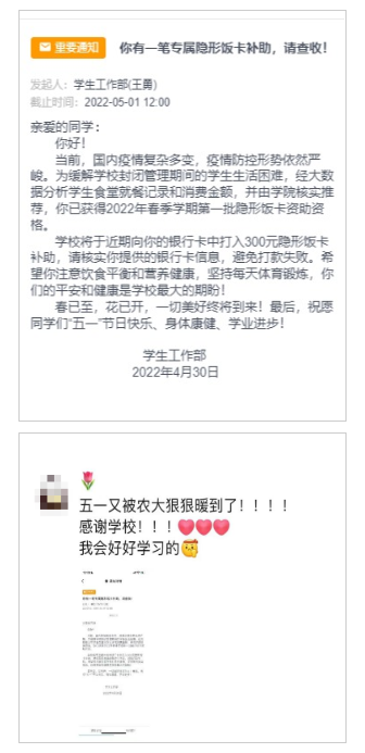 本次“隐形补助”发放过程中,东北农业大学通过比对学生校园卡食堂消费记录,发现有335名学生每餐消费标准远低于全校学生平均水平。同时,该校通过各学院辅导员对以上学生情况进行摸排,确认多为受疫情影响较大的家庭经济困难学生。本次关爱经济困难学生工作,东北农业大学决定向335名学生发放总额10.05万元的春季学期第一批“隐形饭卡补助”,近期每人300元的用餐补助将打入受助学生的银行卡中。