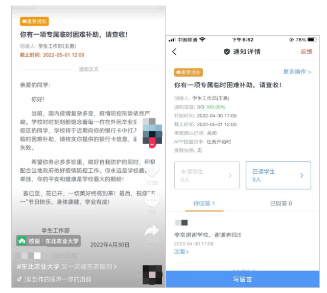 对个别因毕业实习滞留在上海市、长春市中高风险地区的家庭经济困难学生,由辅导员统计相关信息后,学校给予每人500-1000元不等的临时困难补助。并通过“今日校园”发送慰问信息,嘱咐学生做好自我防护的同时,积极配合当地政府做好疫情防控工作。一句“你永远是学校最深的牵挂,你的平安和健康是学校最大的期盼”,让因实习滞留在中高风险地区的毕业生感到内心温暖。