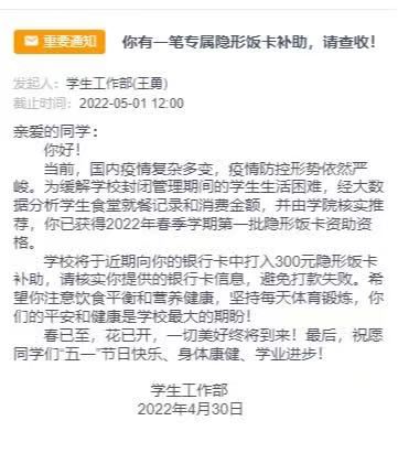 本次“隐形补助”发放过程中,学校通过比对学生校园卡食堂消费记录,发现有335名学生每餐消费标准远低于全校学生平均水平。同时,学校通过各学院辅导员对以上学生情况进行摸排,确认多为受疫情影响较大的家庭经济困难学生。本次关爱经济困难学生工作,学校决定向335名学生发放总额10.05万元的春季学期第一批“隐形饭卡补助”,近期每人300元的用餐补助将打入受助学生的银行卡中。