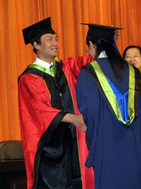 资源与环境学院全体毕业研究生在规范着装后,于7月3日上午8:10之前按照座位号对号入座完毕。毕业典礼于8:30在庄严的国歌声中正式开始。李庆章校长莅临毕业典礼现场;大会由秦志伟副校长主持;包军副校长宣读了授予博士、硕士学位的决议。随后,三位校领导亲自为2007届毕业研究生授予学位。资源与环境学院5名毕业研究生代表荣幸登台,接受了校领导的学位授予仪式。