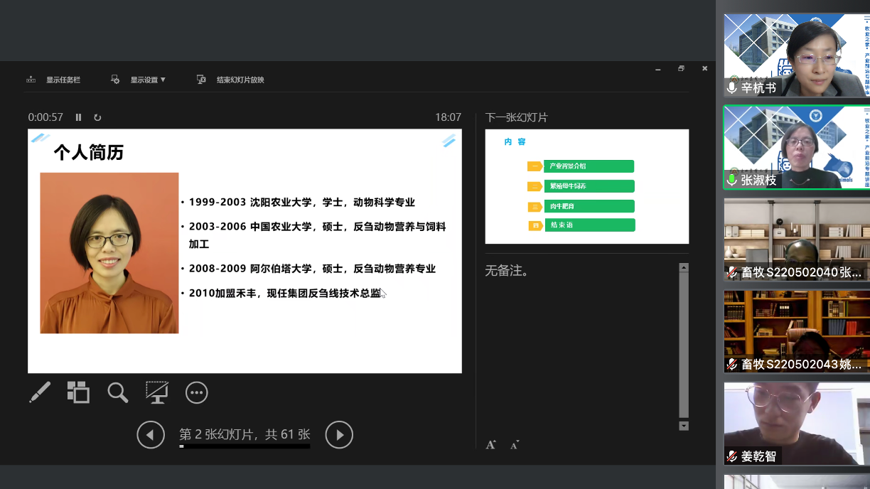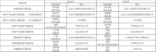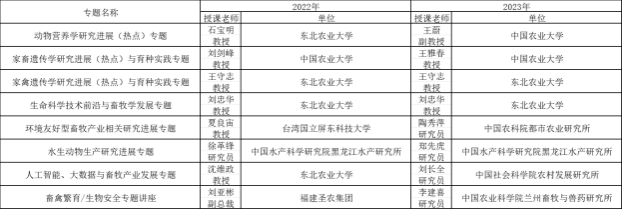 课程实施两年共邀请行业内知名学者教授18名(校内7名,校外11名),企业家或技术专家9名,分别从畜禽遗传育种与繁殖、动物营养与饲养、动物生产以及相关交叉前沿作主题报告,并设置交流互动环节,用创新思维激发“智慧火花”,开辟“研途共进”之路。