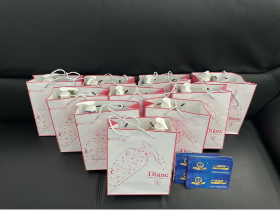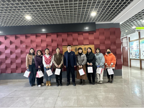 活动中,于向国向女教职工送上精心准备的礼品和电影券,并合影留念。