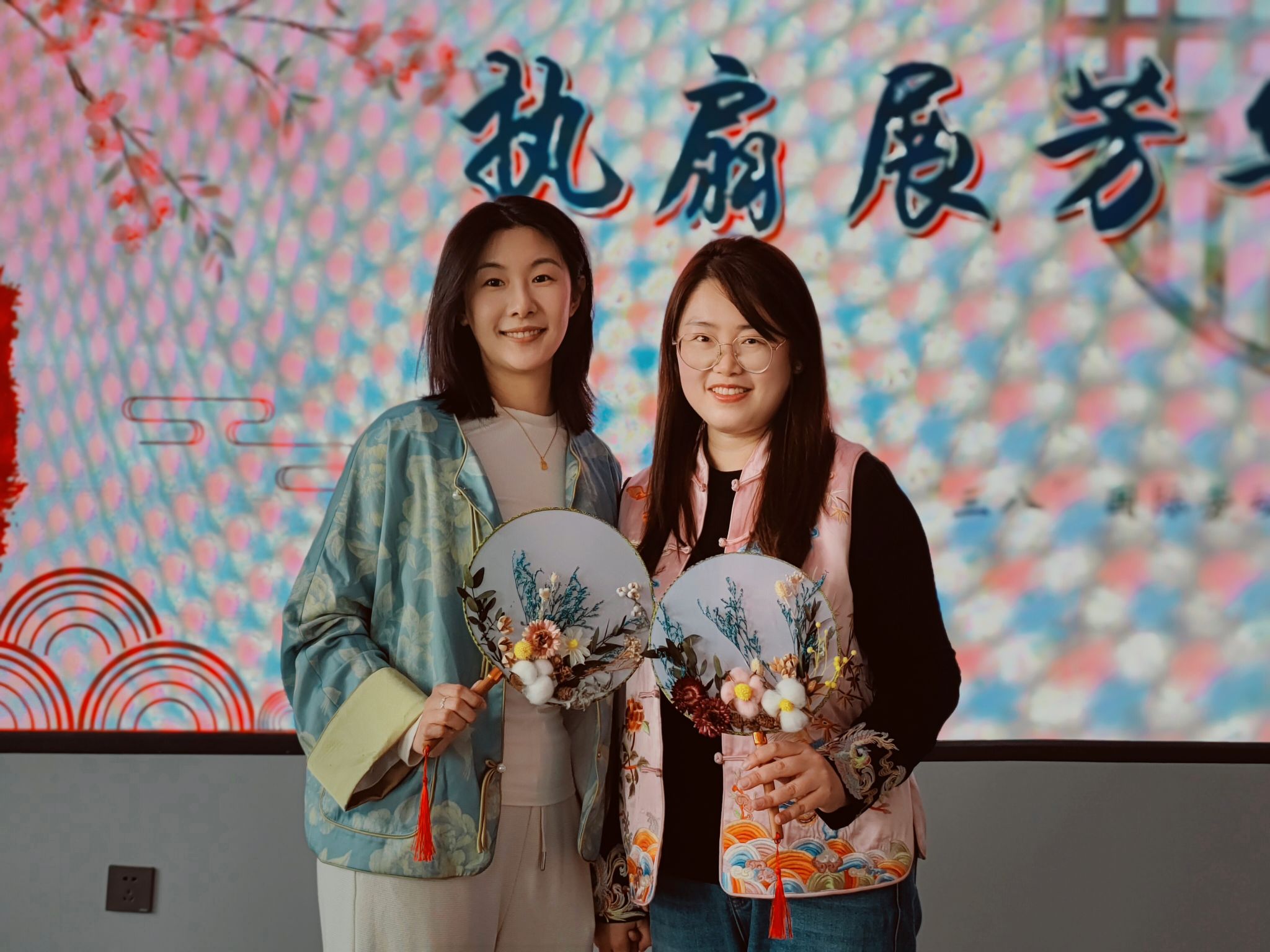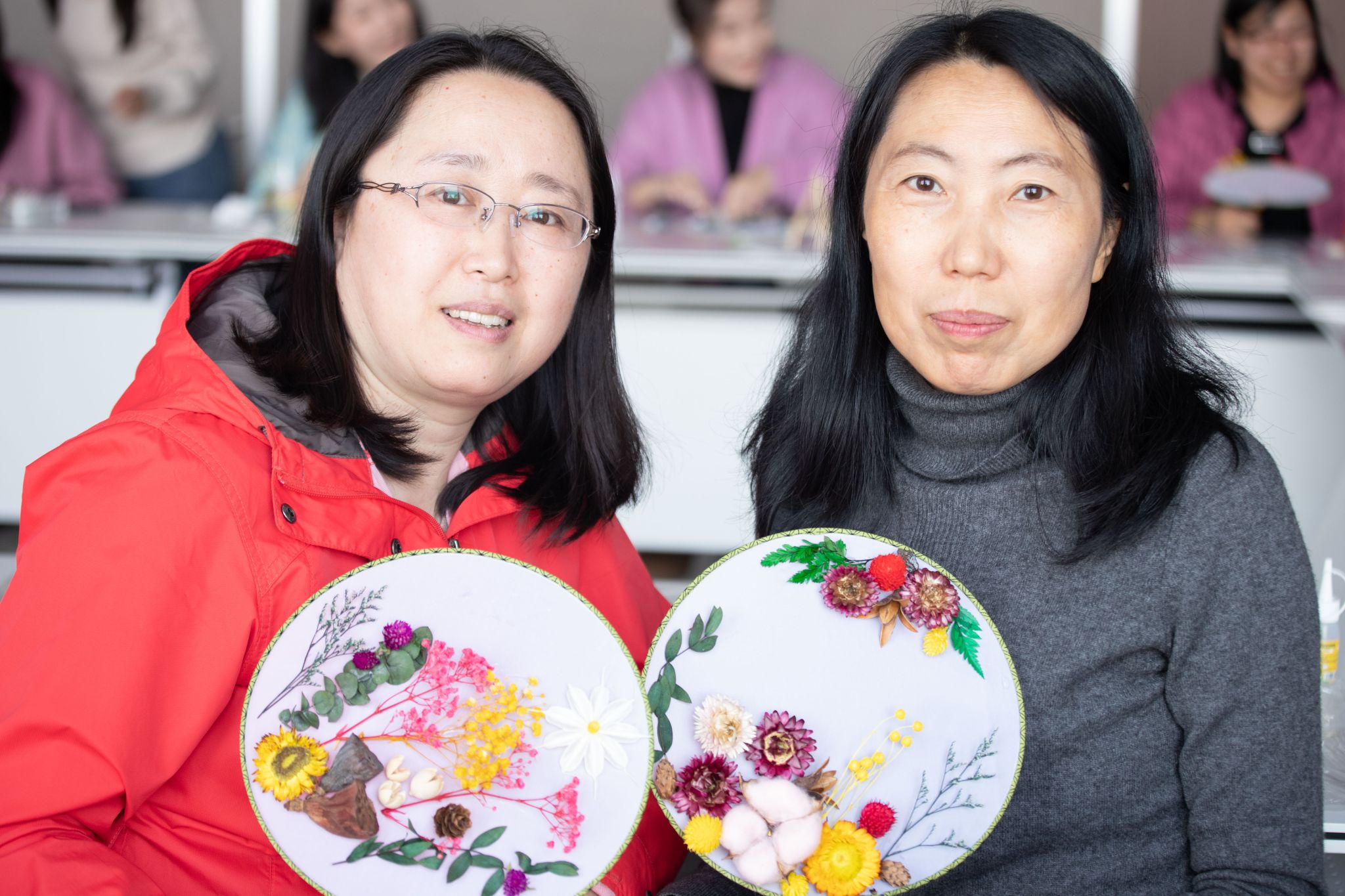 活动中,发放了空白扇子、永生干花和各种辅料工具,大家发挥想象力巧思构图,从色彩到形状,从选取到粘贴,大家热情高涨,相互借鉴学习,在团扇上粘贴莲花、兰草、薰衣草等装饰物,经过一个小时的制作,让原本平淡无奇的扇面开始变得缤纷多彩,一把把融入了中国传统文化意境美、诗意美以及美好祝福的团扇便制作而成……一幅幅独具匠心、清新淡雅的美景便呈现在眼前,欢声笑语中大家纷纷合影留念。