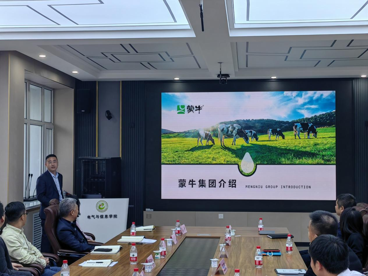 随后,双方在电信楼219会议室开展现场座谈。座谈环节由汪文斌主持。万庆生代表电气与信息学院对贺永强一行的到来表示热烈的欢迎。戴百生介绍了学院学科、师资队伍、人才梯队建设等基本情况。沈维政介绍了智慧畜牧创新团队的各个研究方向及研究内容,并介绍了相应研究成果。田茂对蒙牛集团进行了详细介绍。他表示,蒙牛集团作为中国乳业“国家队”,主动承担起实现奶业振兴的重大责任,将技术、人才、交易平台等资源进行整合,聚焦优质牧草种植、优良品种培育、优质奶源基地建设等各关键环节持续发力,创新驱动奶产业链高质量发展,围绕“更营养、更智慧、更绿色”领先战略目标,打造出了一条独具中国乳业特色的奶产业链。
