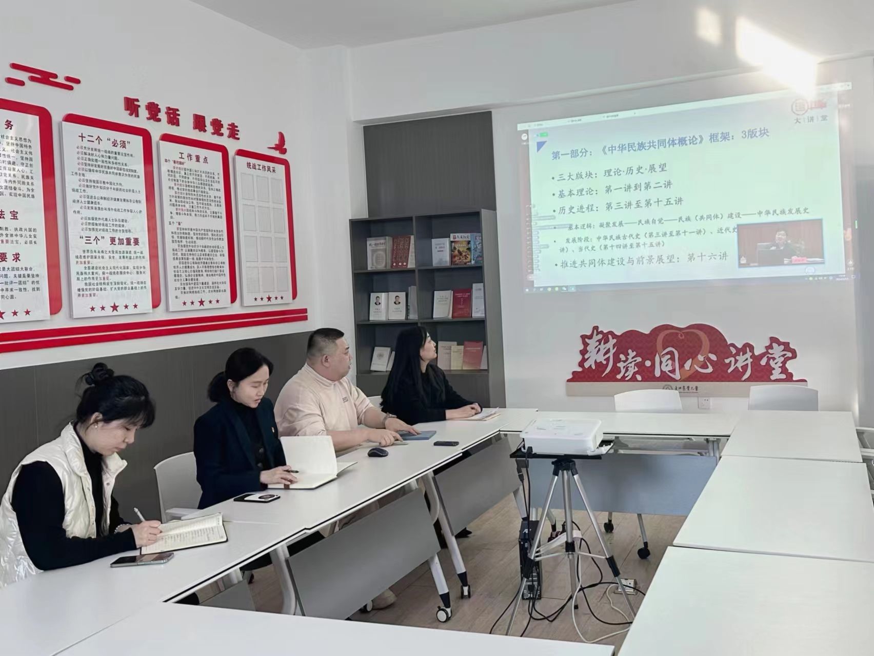 为进一步加强学校铸牢中华民族共同体意识教育,更好推动中华民族共同体概论课程试点建设,作为中华民族共同体概论课程首批试点高校,按照省委教育工委统一部署安排,3月12日下午,学校统战部组织全体统战干部和马克思主义学院担任《中华民族共同体概论》课程任课教师,通过“道中华”直播平台学习收看“道中华大讲堂”第八场暨 《中华民族共同体概论》导读讲座。