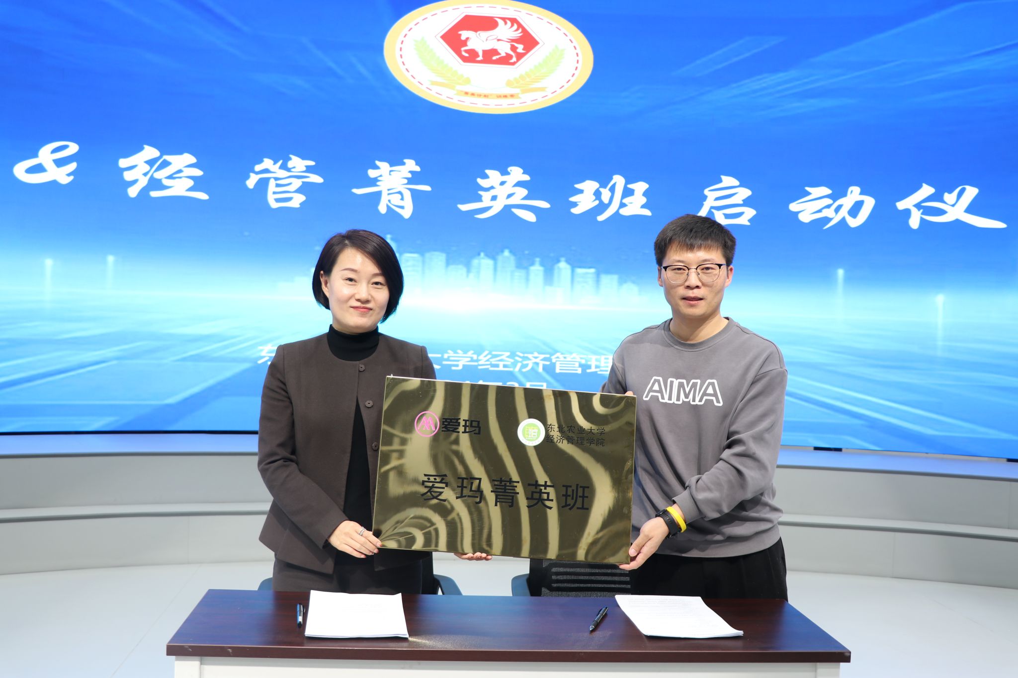宋跃芬、王洪亮、余志刚共同为班级代表授班徽。高天琦代表经济管理学院与爱玛科技集团签署合作协议。此次校企合作有力推进了“菁英”计划的落地生根,也是经济管理学院培养人才的重要举措。