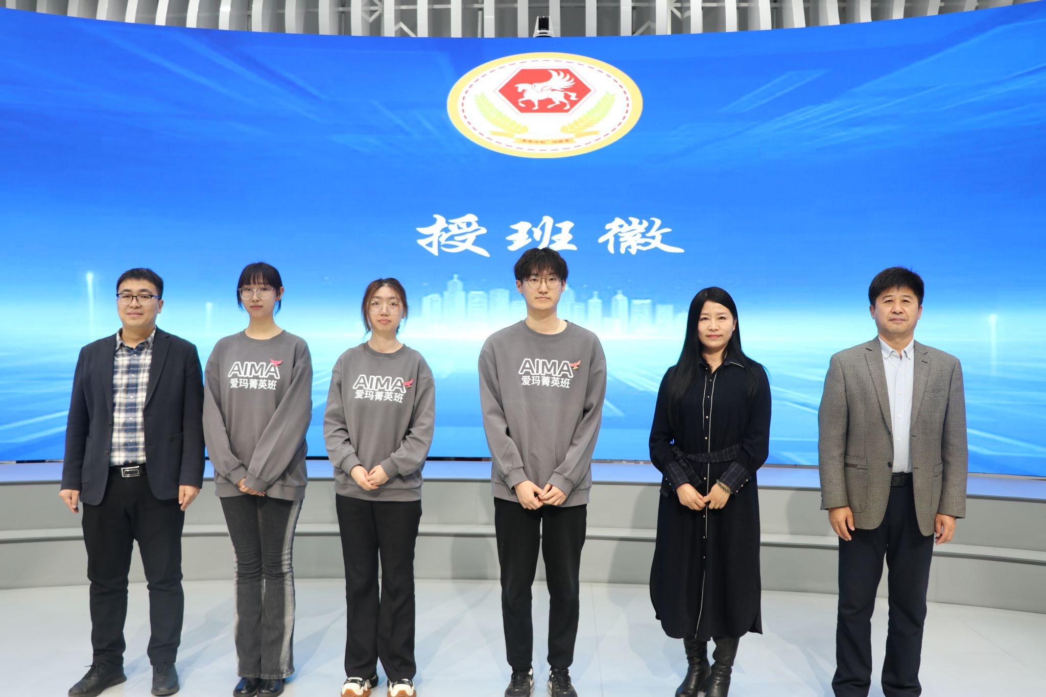 宋跃芬、王洪亮、余志刚为爱玛·经管菁英班成员代表授班徽