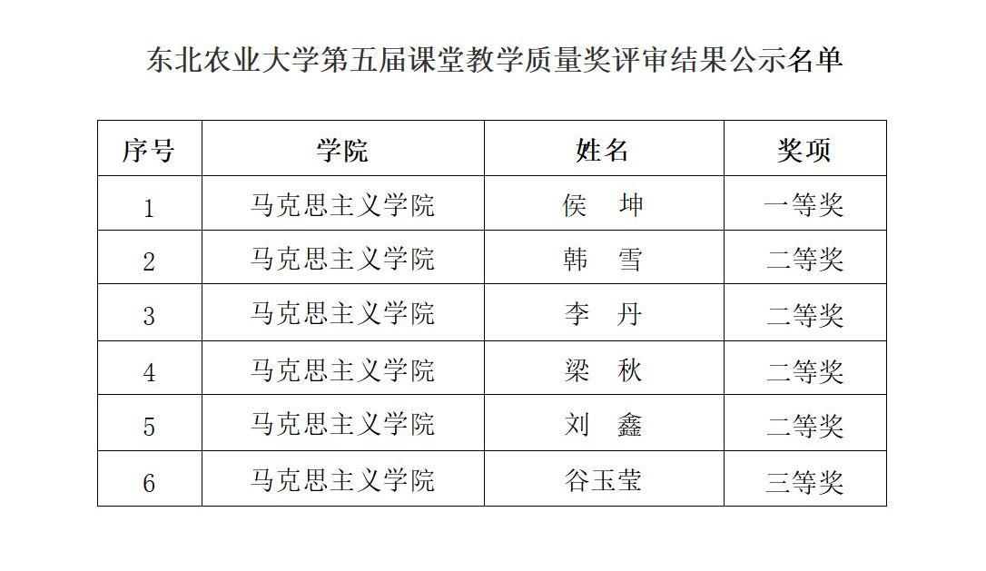 近日,东北农业大学组织开展第五届课堂教学质量奖评选工作。经教师自愿申报、学院推荐、专家和学校督导随机听课、学生评价、现场观摩展示等程序,综合评选出东北农业大学第五届课堂教学质量奖获得者35人。马克思主义学院再创佳绩,共获6项荣誉奖项,其中一等奖1项、二等奖4项、三等奖1项。