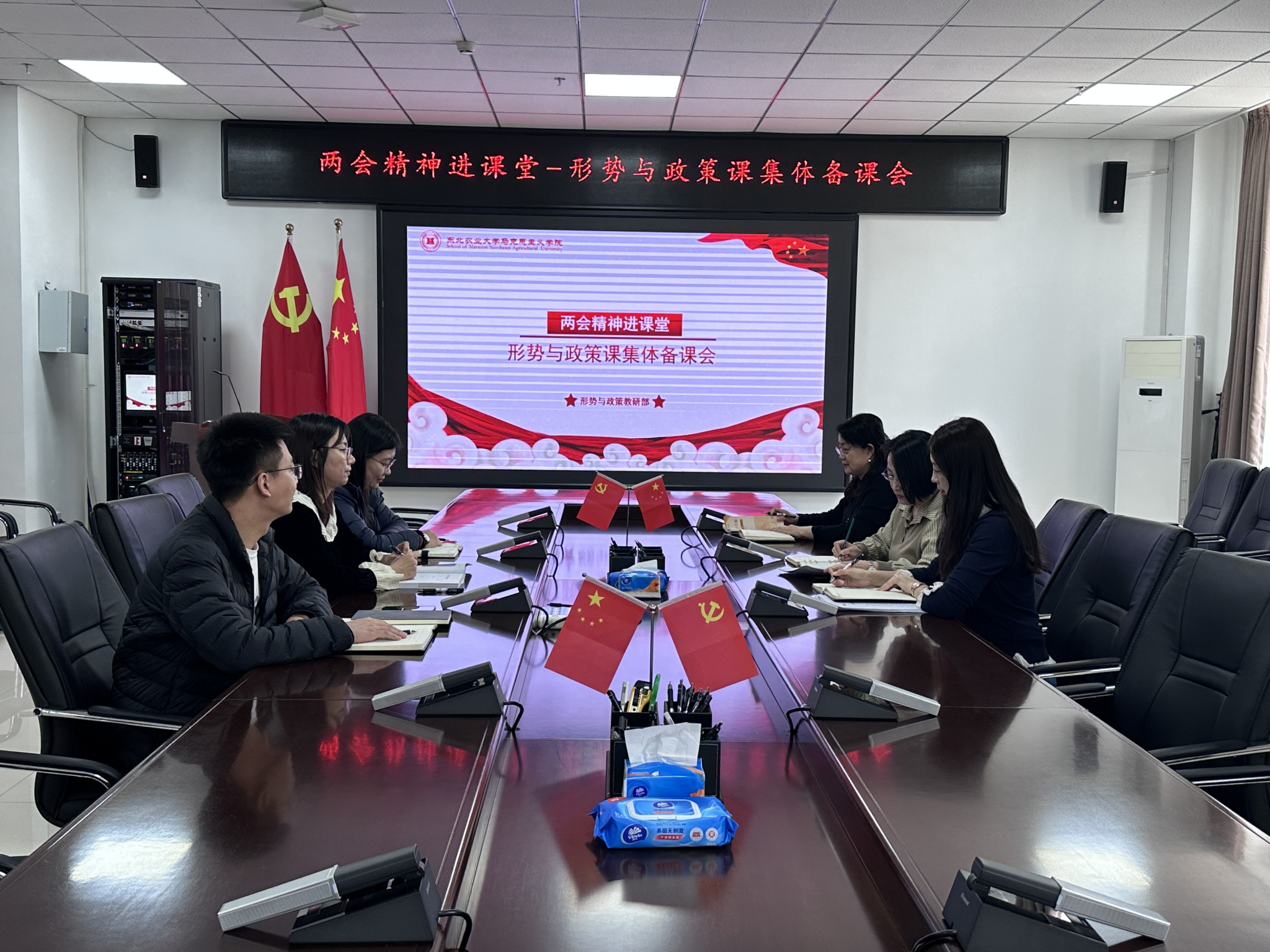 为认真学习宣传贯彻2024年全国两会精神,充分发挥高校思想政治理论课宣传主阵地作用,马克思主义学院形势与政策教研部于3月20日开展全国两会精神进课堂集体备课活动,通过集体备课,教师能够更加准确理解和把握全国两会精神的内涵实质,并围绕如何将全国两会精神融入本学期教学内容开展研讨。通过丰富教学内容、创新教学方法、优化教学活动等方式,充分发挥教师主导性和学生主体性,多措并举推进全国两会精神鲜活地融入形势与政策课教学。
