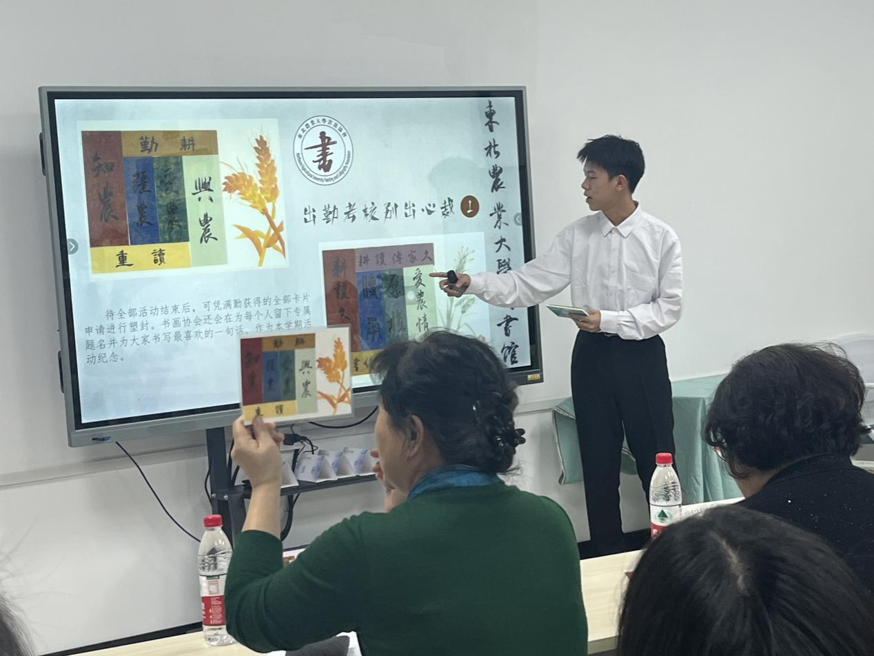 在启动会现场,书画协会依托东北农业大学校园耕读文化建设理念和苏轼的《三槐堂铭》,将“传承耕读文化,厚植爱农情怀”“勤耕重读,知农爱农,强农兴农”“耕读传家久,诗书继世长”等具有代表性的活动理念以书法的形式制成入场卡片。OEA口语协会在现场讲解了活动细则;中华文明协会介绍了二十四节气的由来等关乎农耕传统的知识普及;尔雅茶学社为现场师生讲解了茶文化的基础知识,进行了盖碗茶的茶艺表演,为所有现场同学斟满了一杯杯香浓的熟普洱茶。活动吸引了近百名同学热情参与,现场座无虚席,大家体验其中,反响热烈。会后,胡家英对活动进行了有针对性的指导,再次强调了耕读教育的重要。