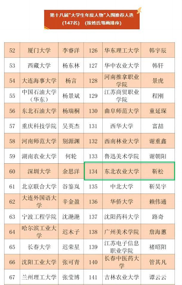 近日,中国大学生在线官微公布了第十八届“大学生年度人物”推选展示活动结果,东北农业大学农学院硕士研究生靳松成功入围推荐人选。