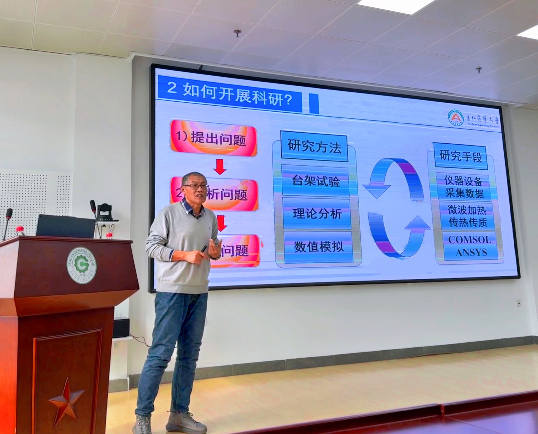 郑先哲教授以“浆果微波加工的科研感想”为主题,从如何走进科研、开展科研、科研创新、取得成果四个方面为同学们讲解自身科研经历和工作体会。郑先哲强调,科研是一个深入且系统的过程,研究生一要具备强烈的求知欲和好奇心,勇于探索未知领域,追求真理,进而明确研究方向和目标;二要严格遵守学术规范,确保研究内容的准确性、可靠性,严格地设计、执行实验或研究方案;三要具备创新思维和能力,敢于挑战传统观念,提出新的理论和方法,在科研实践中关注前沿动态,挖掘新的研究点,努力取得原创性成果;四要具备良好的沟通能力和团队协作精神,与导师、同学和同行保持良好的合作关系。同时,希望每位同学能够珍视学校提供的宝贵平台和学习时光,全力以赴,顺应时势,为未来的自己积蓄力量。