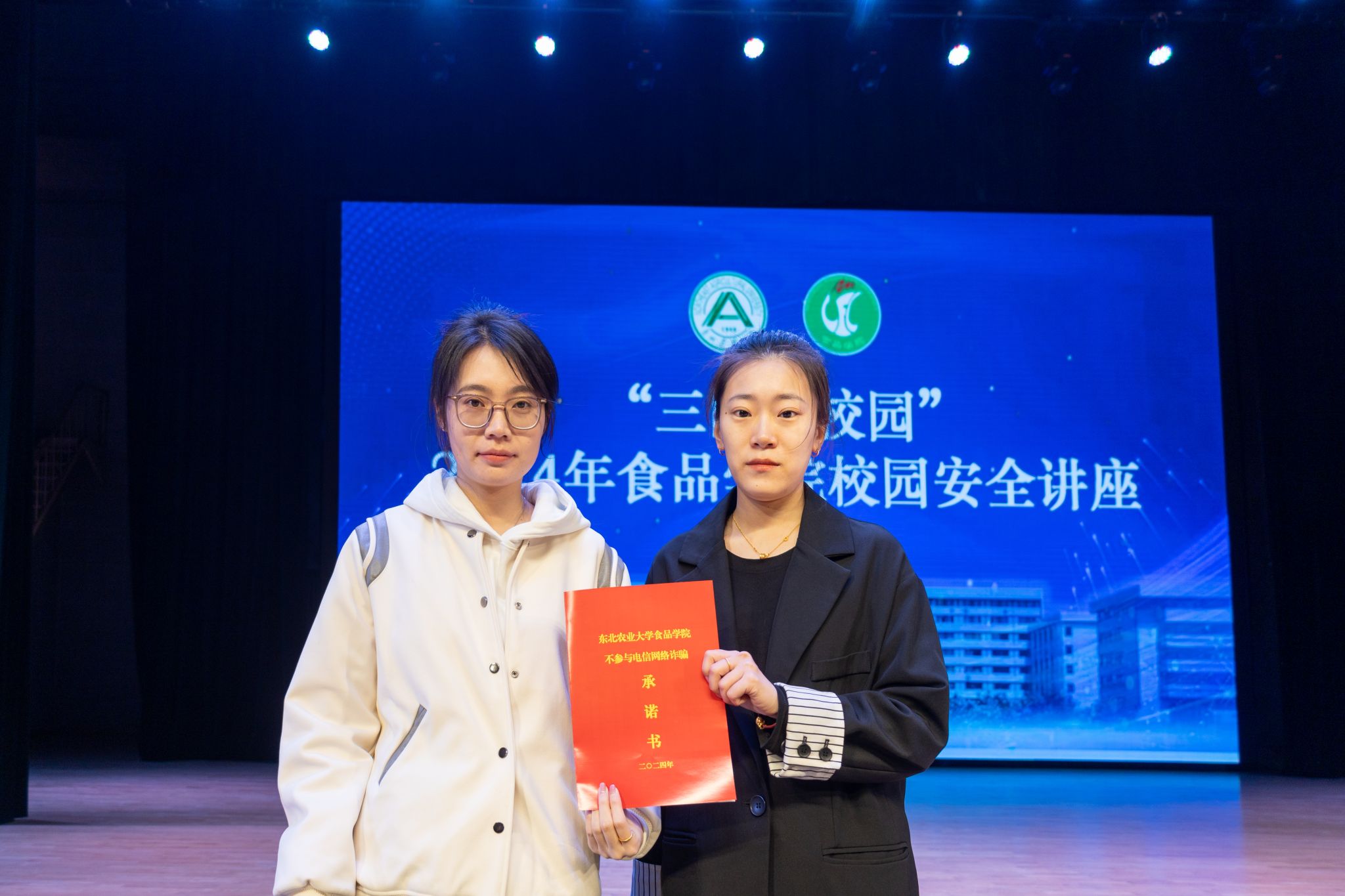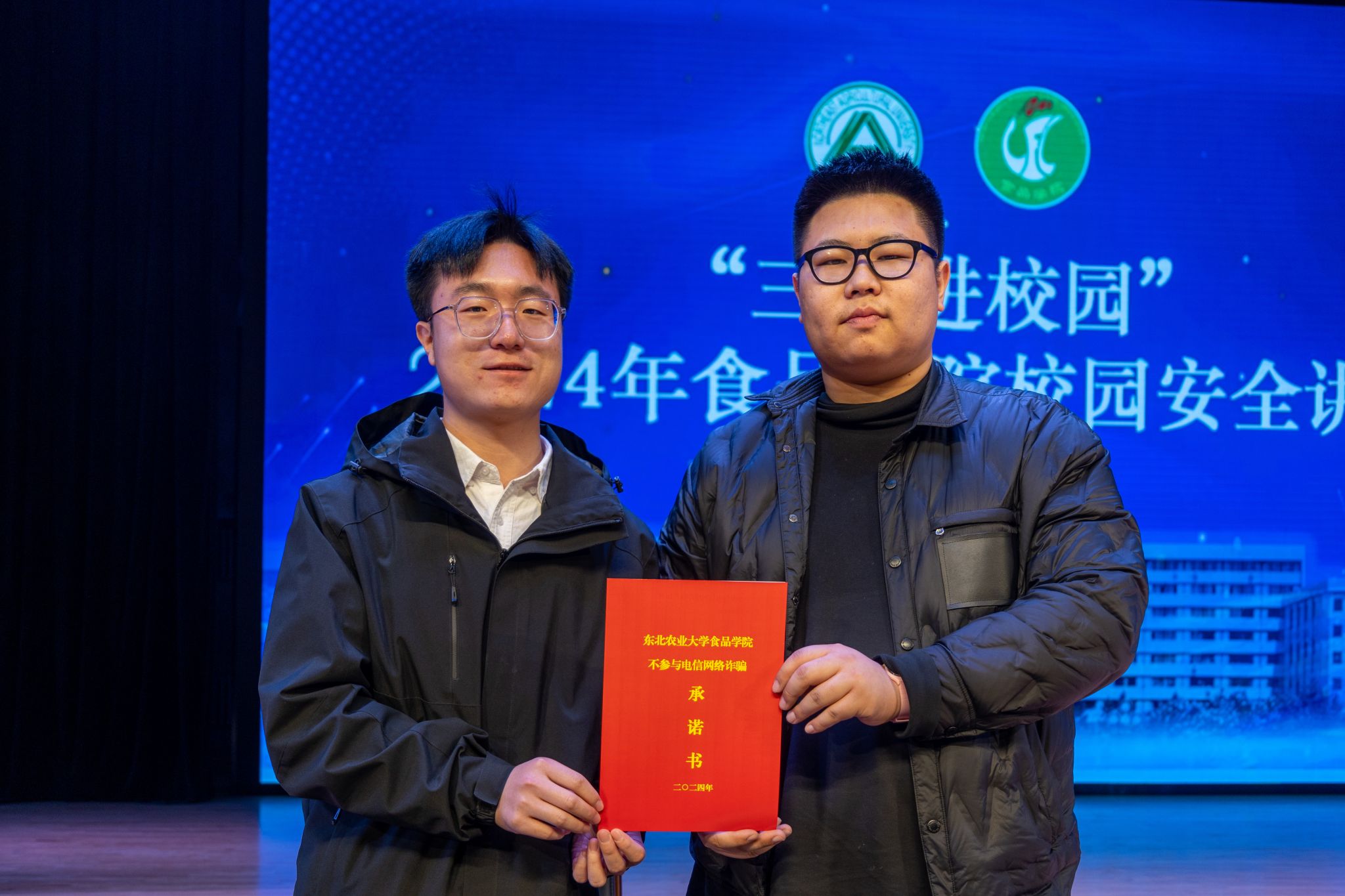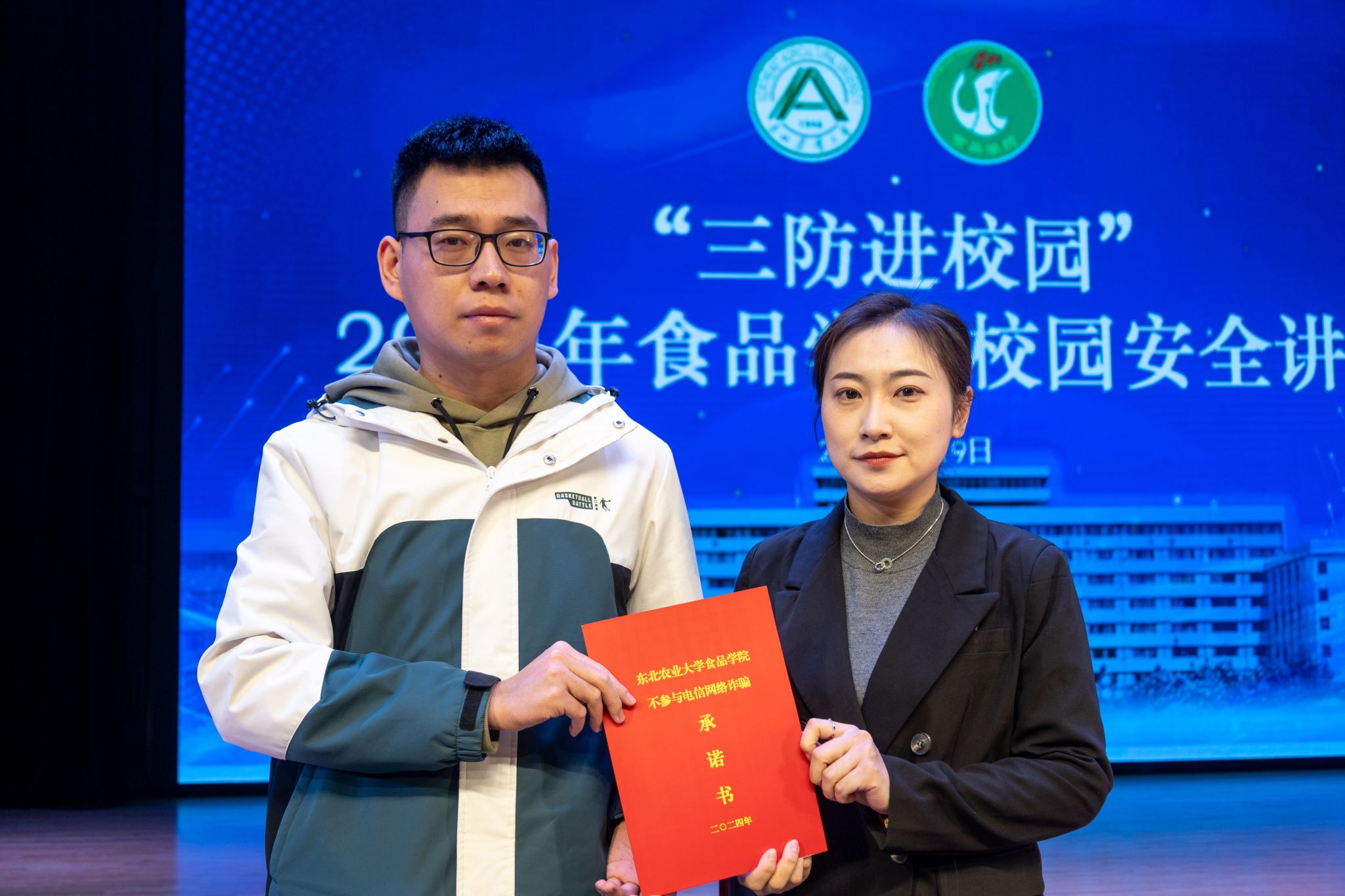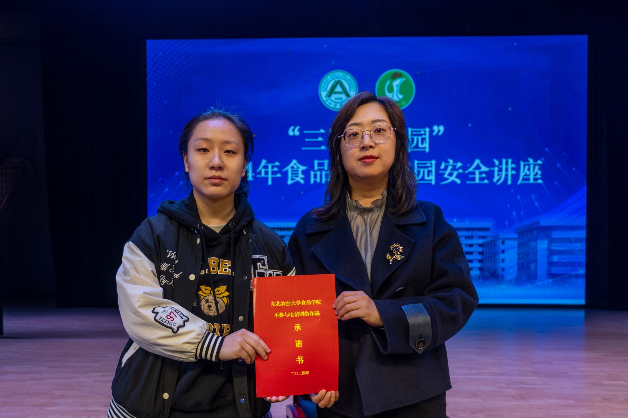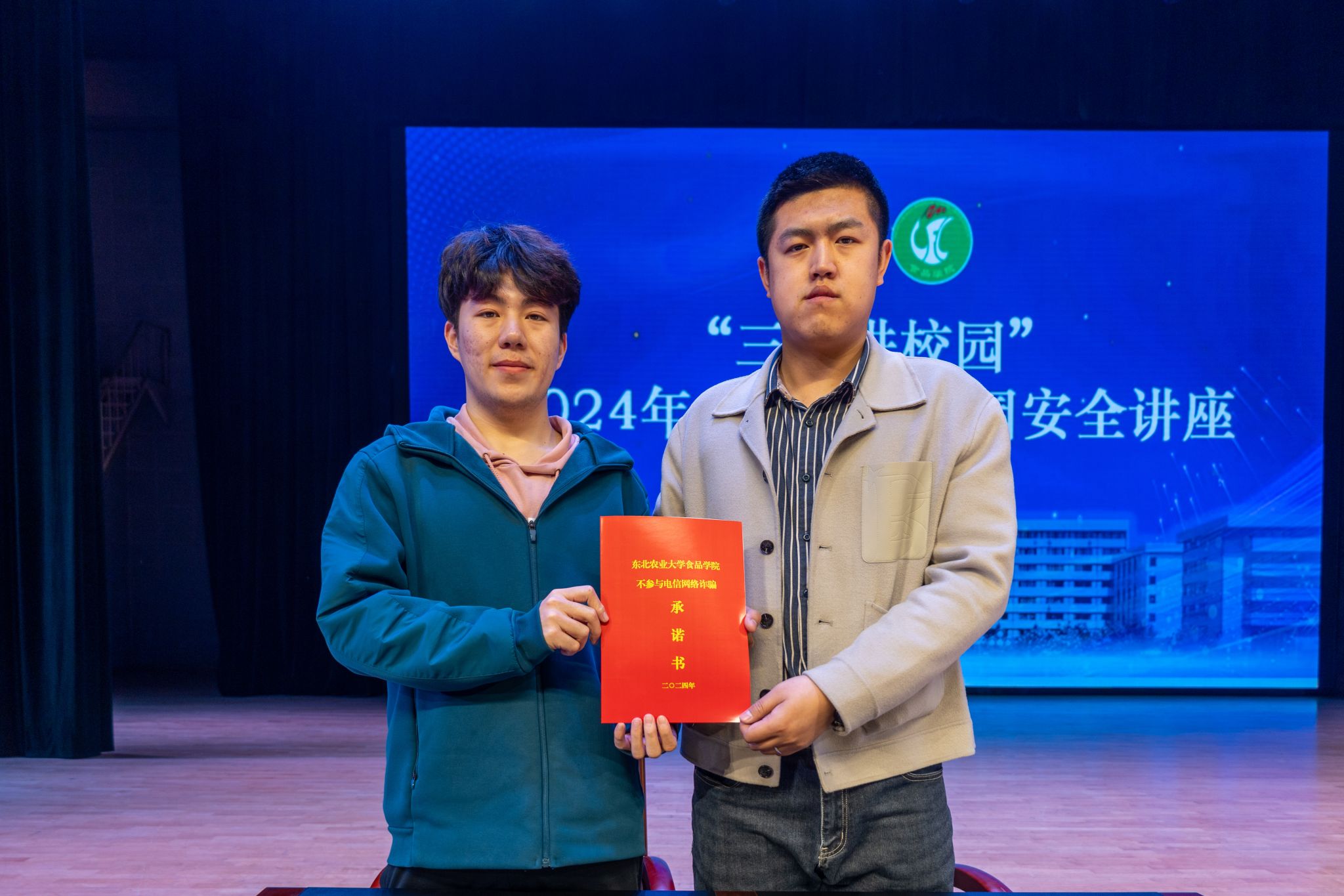 会上,学院辅导员为学生发放并与学生代表分别签订了《食品学院不参与电信网络诈骗承诺书》。