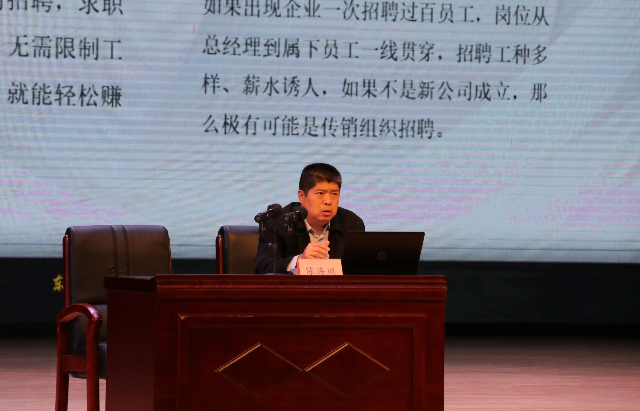 按照学校《关于开展2024年春季开学季“三防”进校园及校园安全法制宣传警示教育活动的通知》要求,切实加强在校学生防范电信网络诈骗、拐卖和性侵等违法行为的意识和能力,遏制校园内此类犯罪案件发生,营造安全健康的校园环境,4月9日,食品学院在音乐厅举办“三防进校园”2024年校园安全讲座,邀请保卫处治安科科长陈海鹏进行校园安全宣讲,食品学院全体辅导员及1200余名学生参加讲座。会议由食品学院党委副书记钱芳主持。