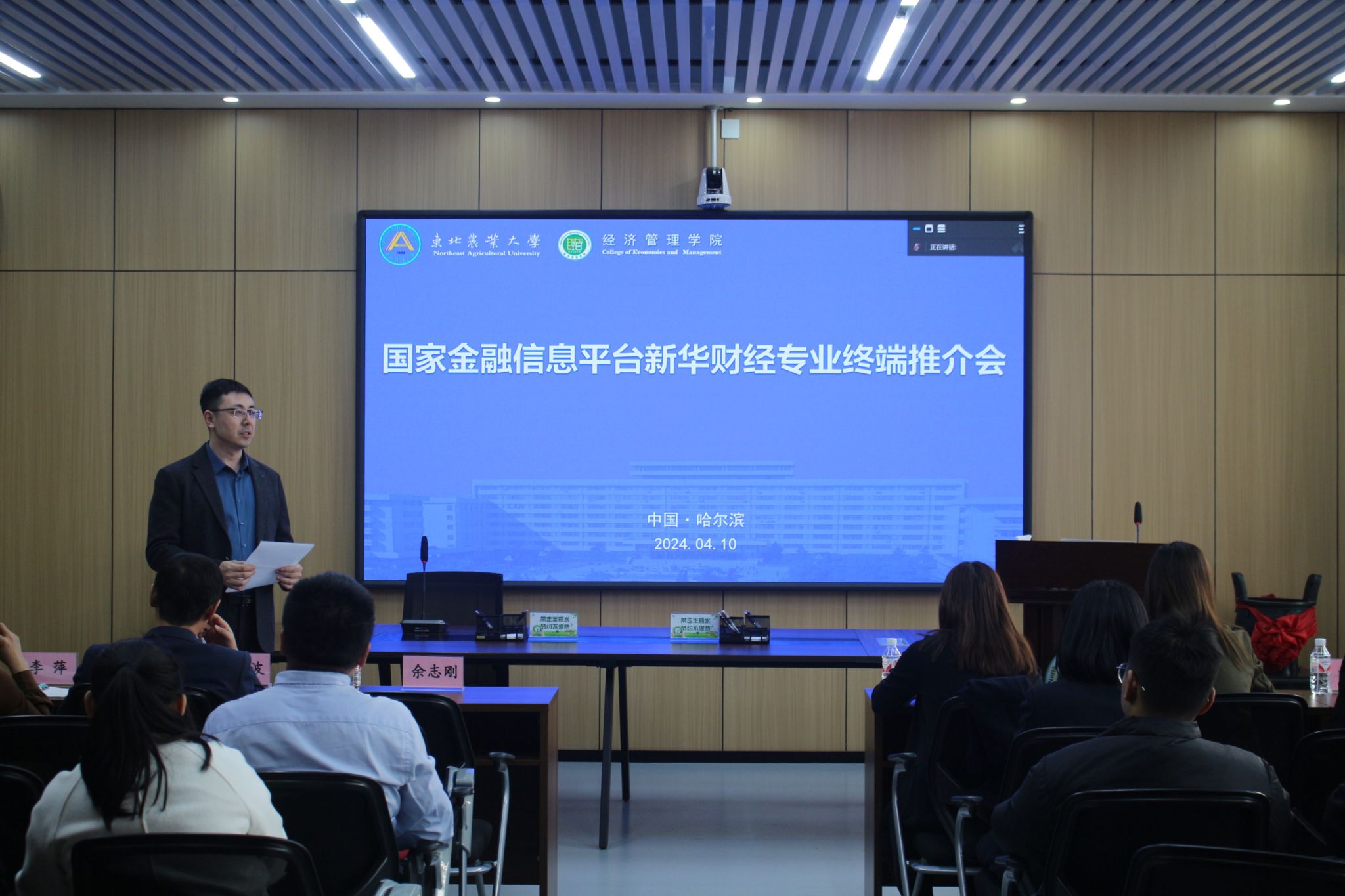 4月10日下午,经济管理学院在成栋楼720会议室召开国家金融信息平台新华财经专业终端数据库推介会。新华财经政府业务部主任韩韬,经济管理学院院长余志刚,黑龙江分公司金融信息中心主任潘璐,新华财经分析师梁月贞,新华财经金融业务部市场经理赵航,新华财经产品中心产品经理叶洋瑃,经管学院金融系、会计系、农经系部分教师及学生参加会议,会议由金融系主任胡畔主持。