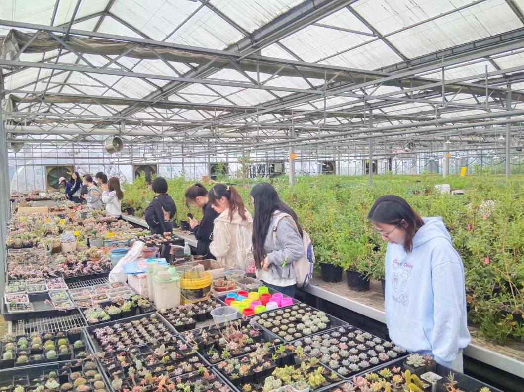 在学校园艺实验站,同学们参观了玻璃温室、塑料大棚、日光温室等设施,认真聆听了园艺园林学院刘在民老师对温室结构、园艺作物生产、现代化育苗和高效栽培技术的讲解。通过参观让同学们对园艺领域有更直观的认识。
