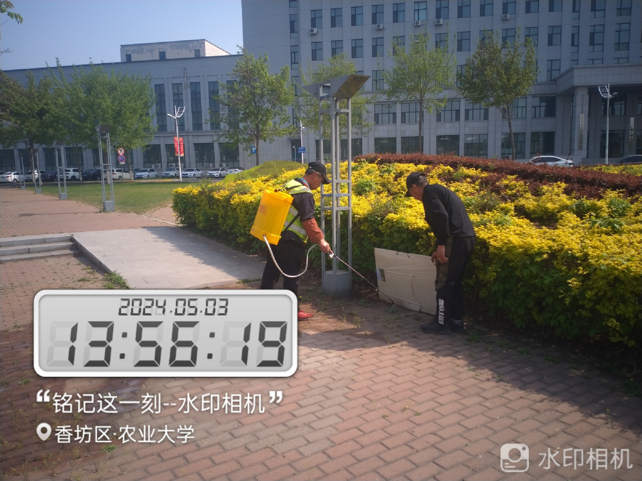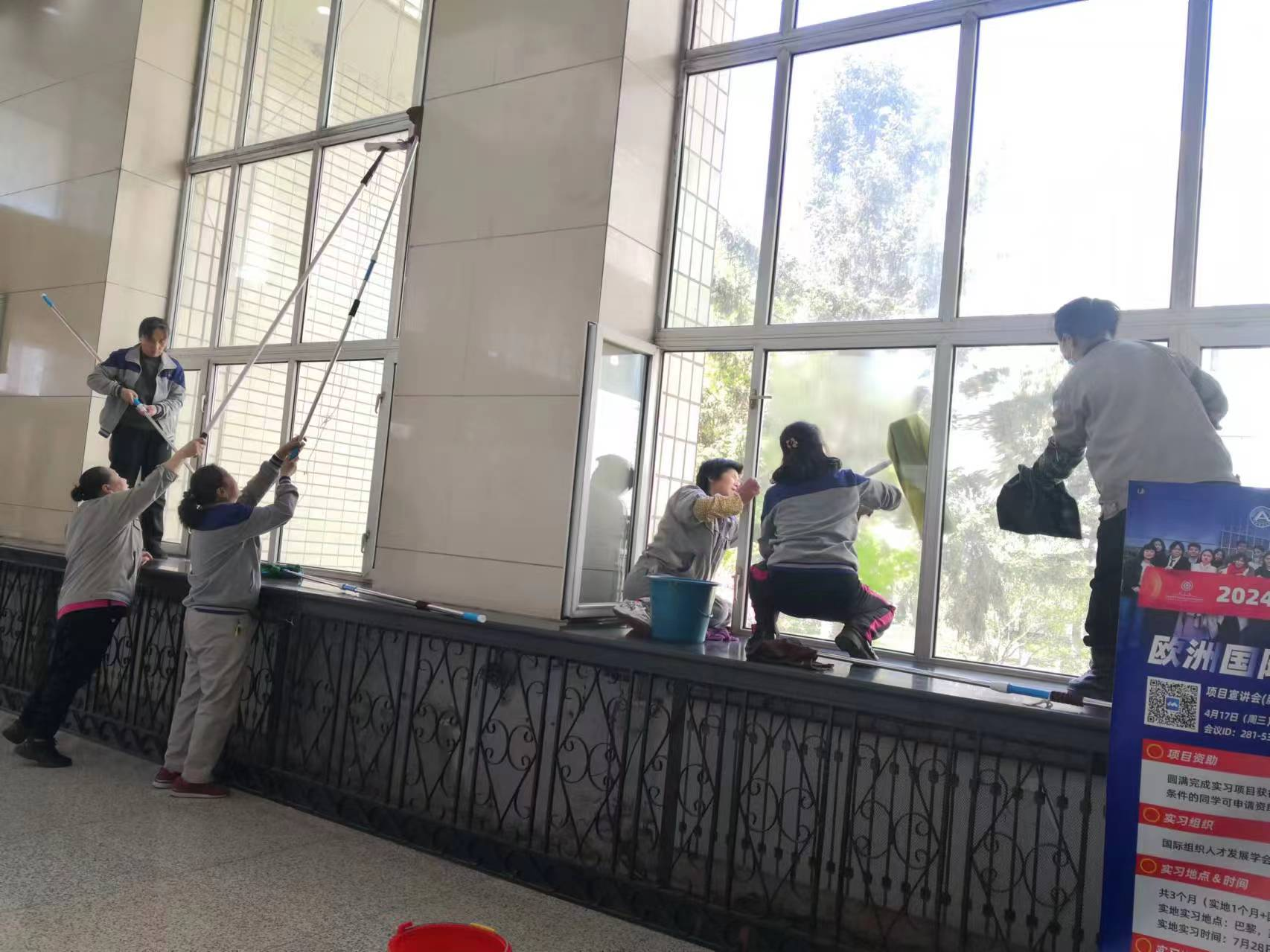 中心组织员工利用假期时间对校园室内外环境卫生开展了集中清理工作。保洁人员秉承“不怕脏,不怕累”的实干精神,对公共楼宇的门窗、墙面、地面、天棚、楼梯扶手、卫生间等卫生死角进行了细致的清理。为预防春季传染病在校园传播,对成栋楼和艺术楼开展了环境消杀工作,同时对楼体四周的杂物进行了清理。外环境保洁人员对校园绿化带中的枯叶和残枝进行了持续的清理,刷洗了指示路牌、雕塑、栏杆、室外垃圾桶等公共设施。为有效防止杂草丛生,对校园内的人行步道板和休闲广场喷洒除草剂,并使用除草机将已经生长的杂草进行清理。通过一线员工的共同努力和默默付出,校园环境得到了明显改善。