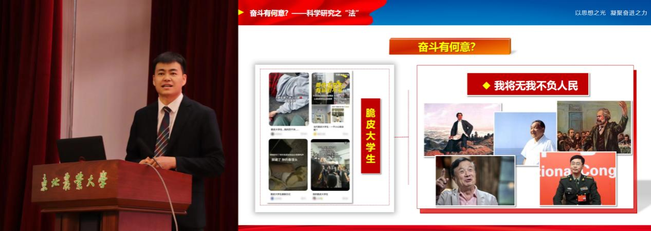 侯坤就“以思想之光,凝聚奋进之力”为主题进行分享,他围绕思想有何用(科学研究之“道”)、奋斗有何意(科学研究之“法”)、青年有何为(科学研究之“术”)三方面核心议题做了深入分析。讲授中,他结合当代青年存在的社会现象及身边榜样力量,引起学生共鸣,引发学生思考、引领学生奋进。他鼓励青年学生面对科学研究,要有“敢啃硬骨头”的闯劲,有“咬定青山不放松”的韧劲,有“生命不息,奋斗不止”的拼劲,在全面建设社会主义现代化强国的新征程上放飞青春梦想。
