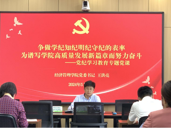 为进一步扎实推进党纪学习教育走深走实,持续提升全院师生党员纪律规矩意识,5月17日,经济管理学院组织召开党纪学习教育推进会暨党委书记讲授专题党课。学院领导班子成员、党委委员、全体党支部书记、各系部办主任及副主任、教师党员代表参加会议。