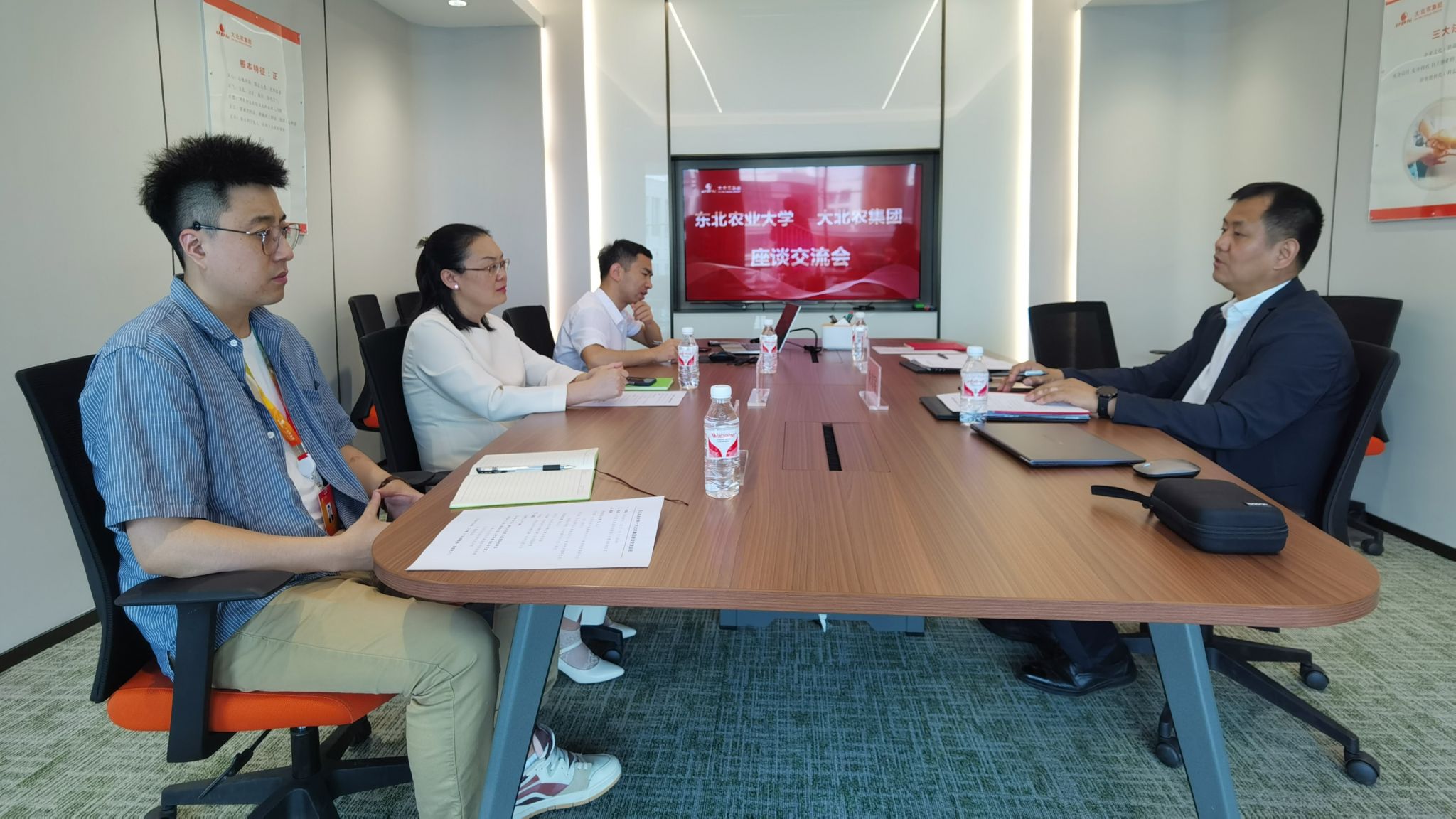 为深入贯彻落实习近平总书记在主持召开新时代推动东北全面振兴座谈会和视察我省期间的重要讲话重要指示精神,进一步深化校企务实合作,推进校企双方战略合作内容落实落地,加快建设现代农业大基地、大企业、大产业,共谋农业科技创新发展之路,5月21日,东北农业大学社会合作与成果转化中心(新农村发展研究院)主任(院长)朱志猛一行前往大北农集团座谈交流。大北农集团研发合作与孵化事业部总监王丹玉、总监助理户俊峰、办公室主任徐博文参加座谈交流会。会议由户俊峰主持。