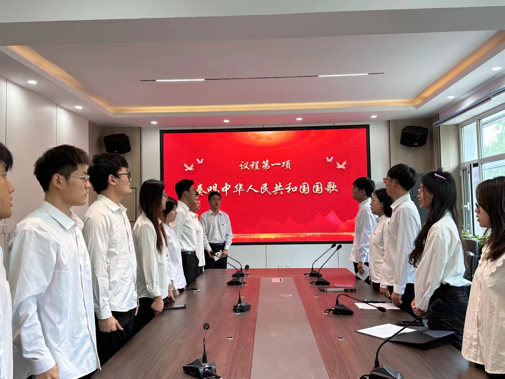 入团仪式在庄严的国歌声中拉开序幕,全体师生整装肃立、高唱国歌。