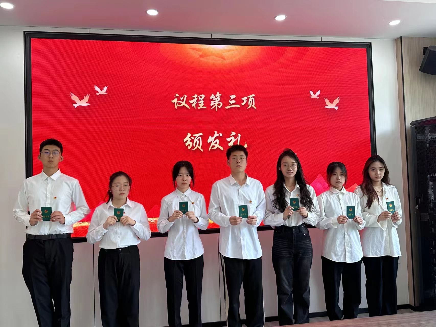 张雨佳宣读新团员名单并祝贺新团员光荣地成为中国共产主义青年团的一员。老团员为新团员同学颁发团证,佩戴团徽。
