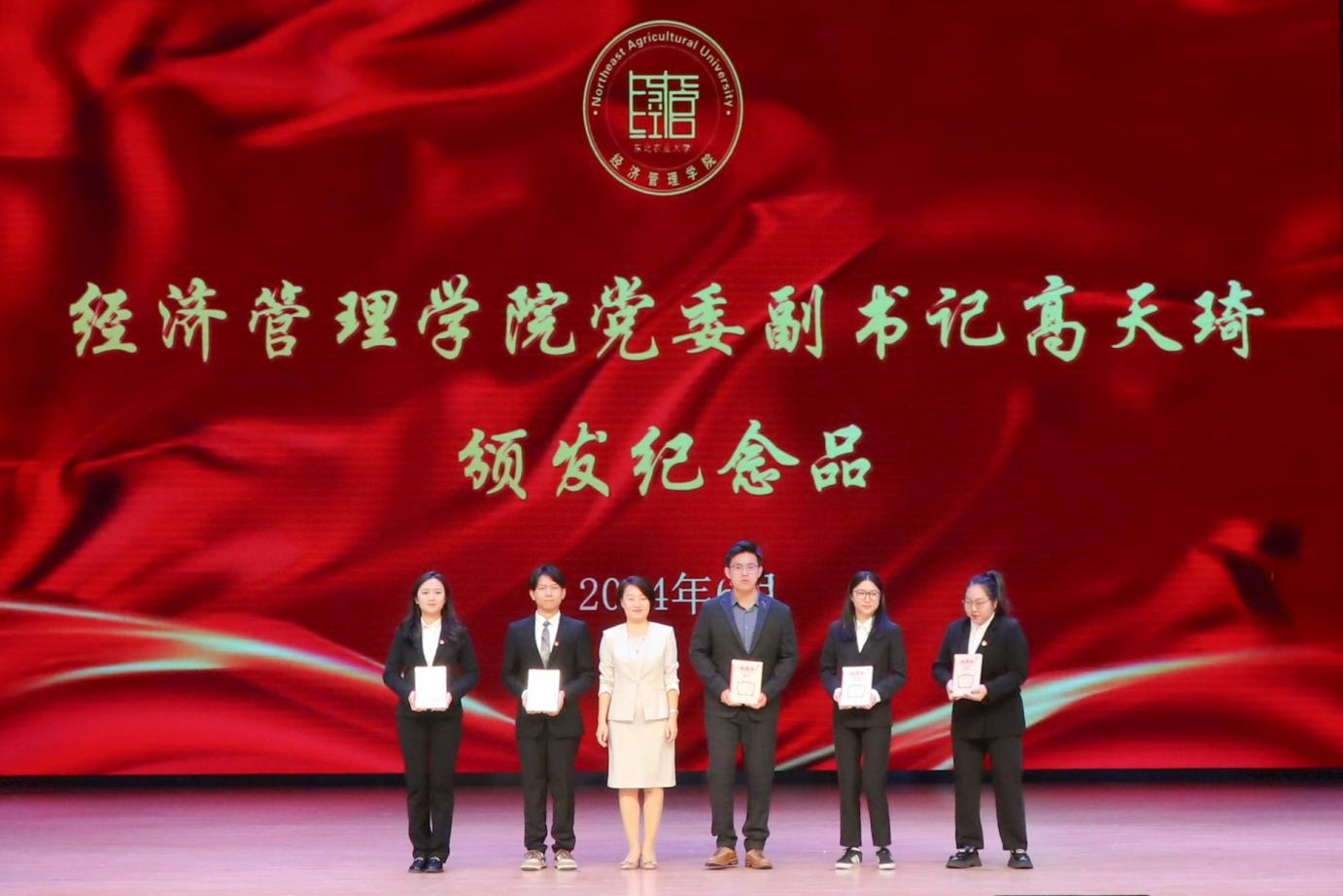 高天琦为五名优秀毕业生代表颁发纪念品,并鼓励毕业生在步入社会后要继续发扬东农精神,继承经管优秀传统,厚植家国情怀,涵养进取品格,在以中国式现代化推进强国建设、民族复兴伟业中展现作为、彰显风采,奋力书写为中国式现代化挺膺担当的青春篇章。