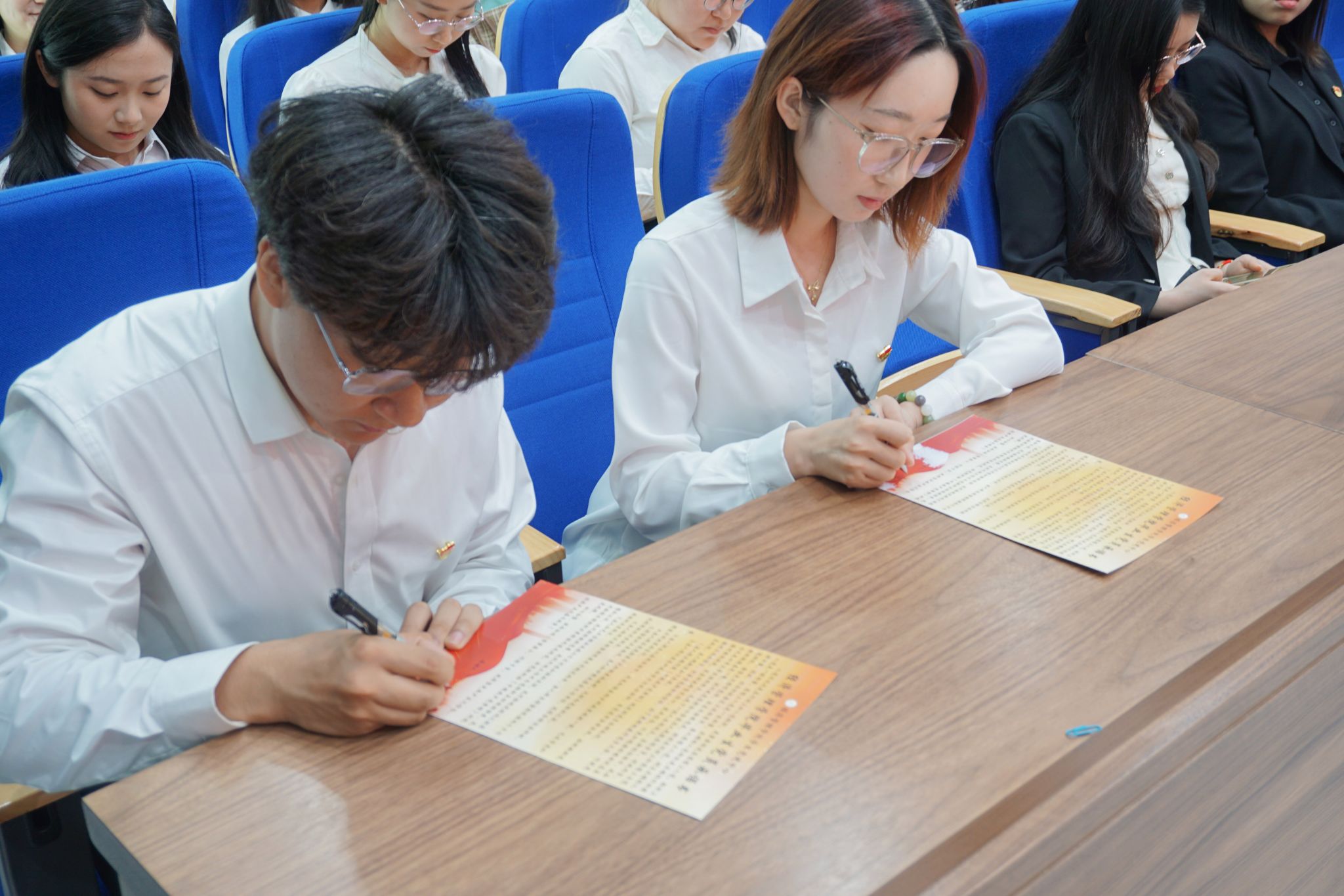 毕业生党员们共同签署党员承诺书。这不仅是对党员身份的再次肯定,也是对未来的庄重承诺。