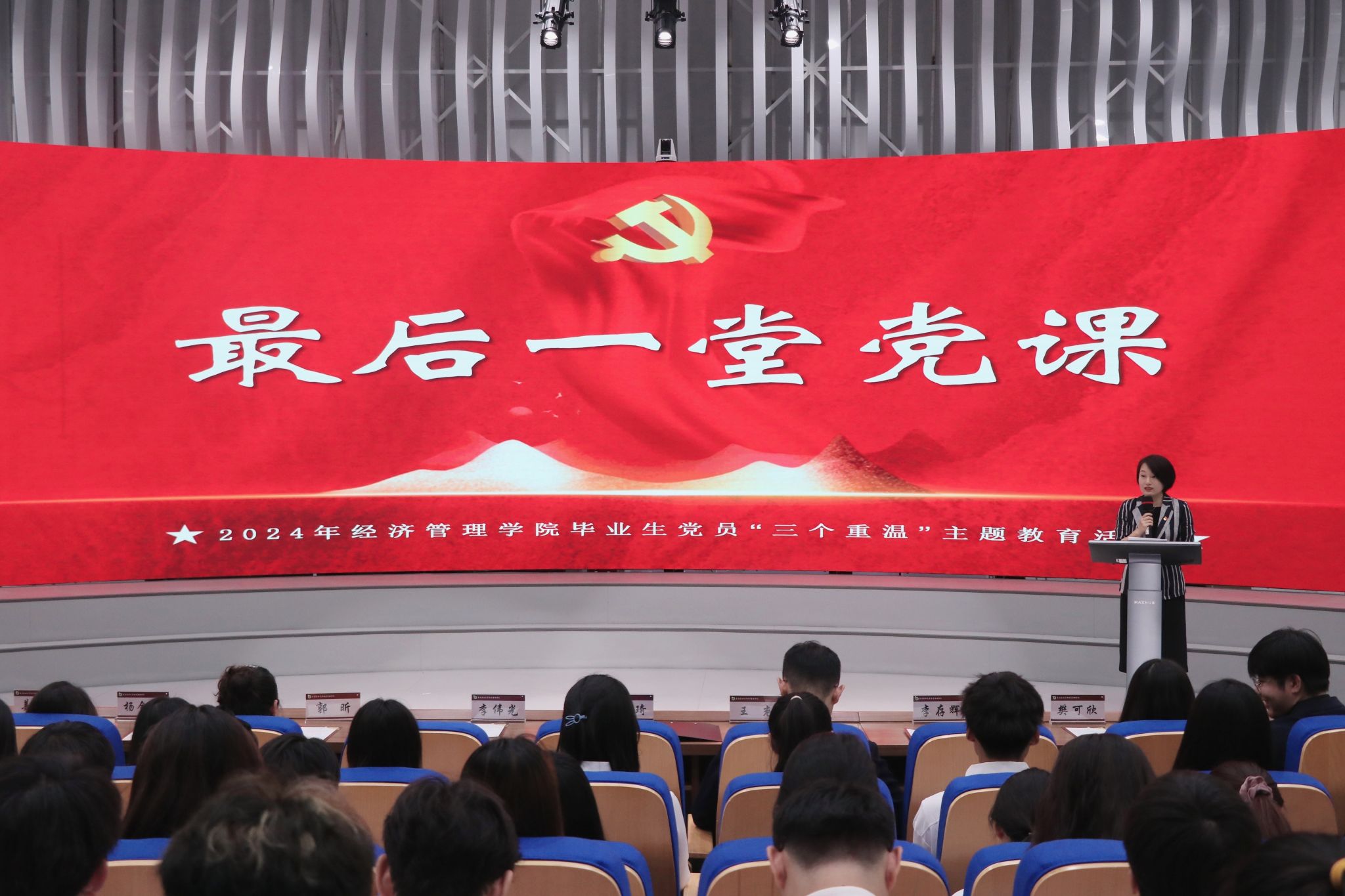 为深入推进学习贯彻习近平新时代中国特色社会主义思想,加强毕业生党员党性教育和思想政治教育,充分发挥毕业生党员先锋模范引领作用,经济管理学院于6月11日在成栋13楼报告厅举办2024年毕业生党员“三个重温”主题教育活动。经济管理学院党委副书记高天琦、学院全体辅导员老师及毕业生党员代表参加活动。本次活动由毕业班辅导员唐宇宙主持。