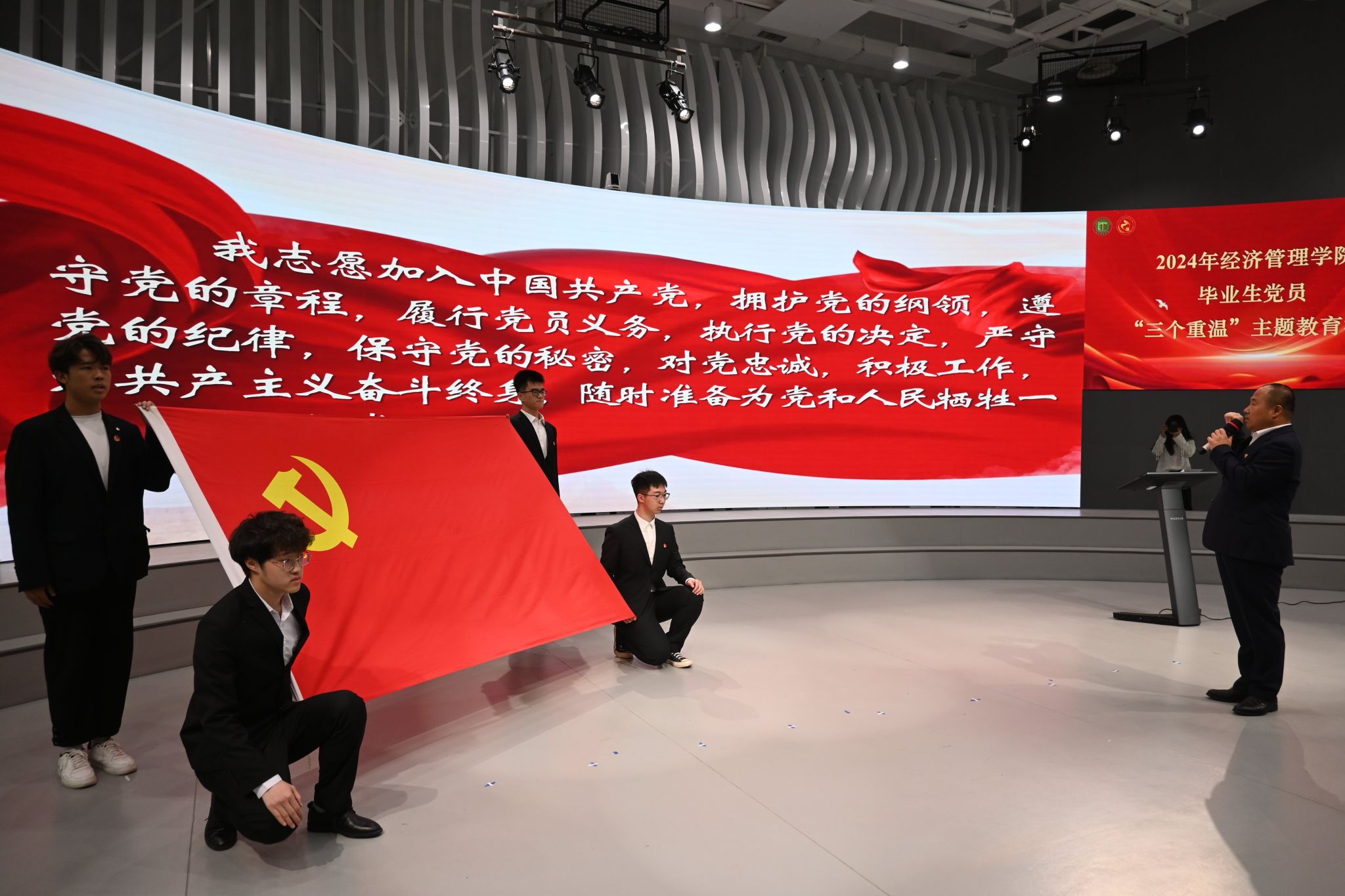 毕业班辅导员刘汉朋、肖扬与毕业生党员代表共同诵读,重温昔日入党谈话环节。老师们的教诲与期盼为学生们指明方向,学生党员们怀揣着对祖国的热爱和对人民的责任感,誓要斩破一切阻碍,披荆斩棘,为祖国的繁荣昌盛和人民的幸福安康奋斗终身。
