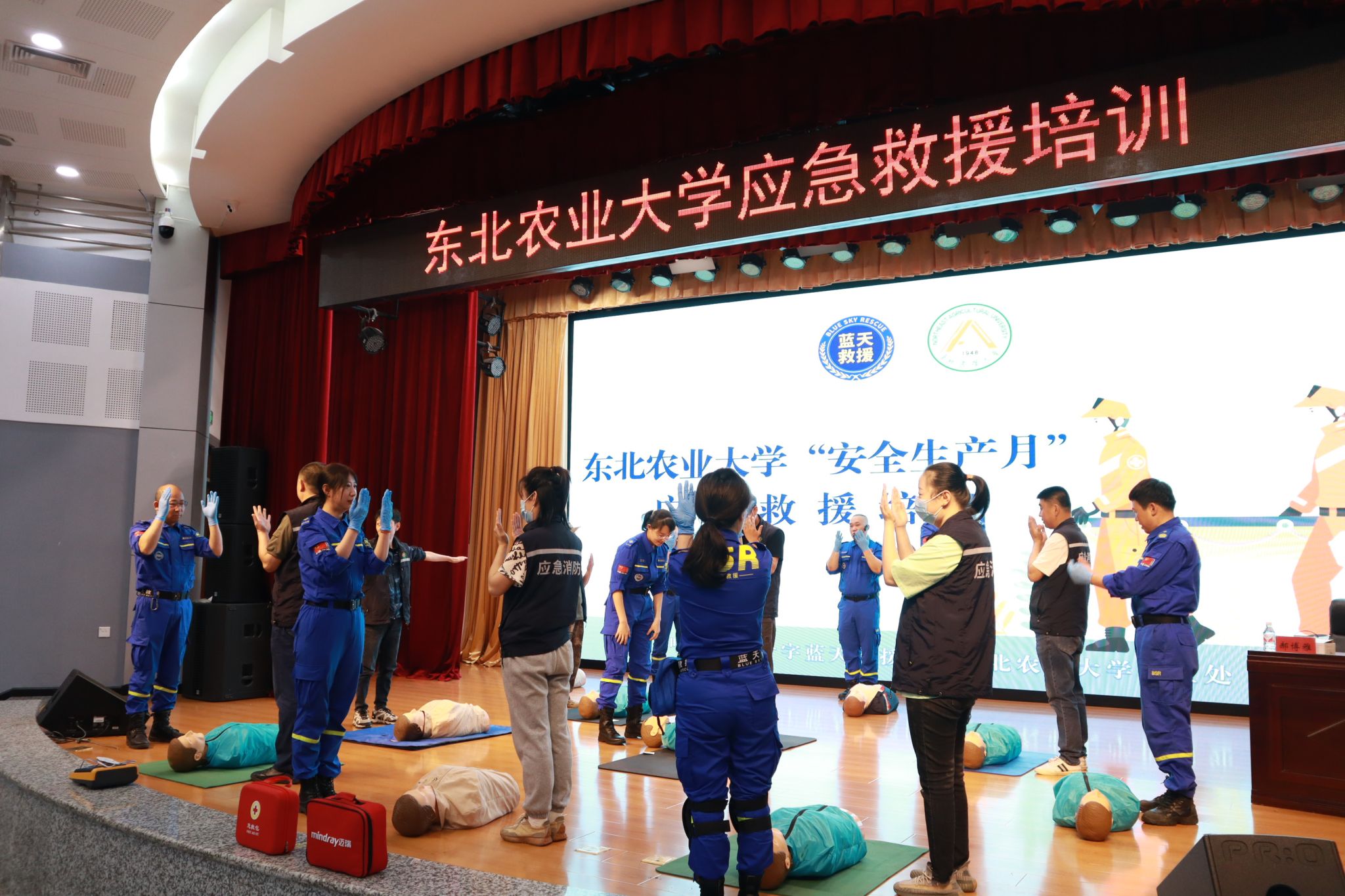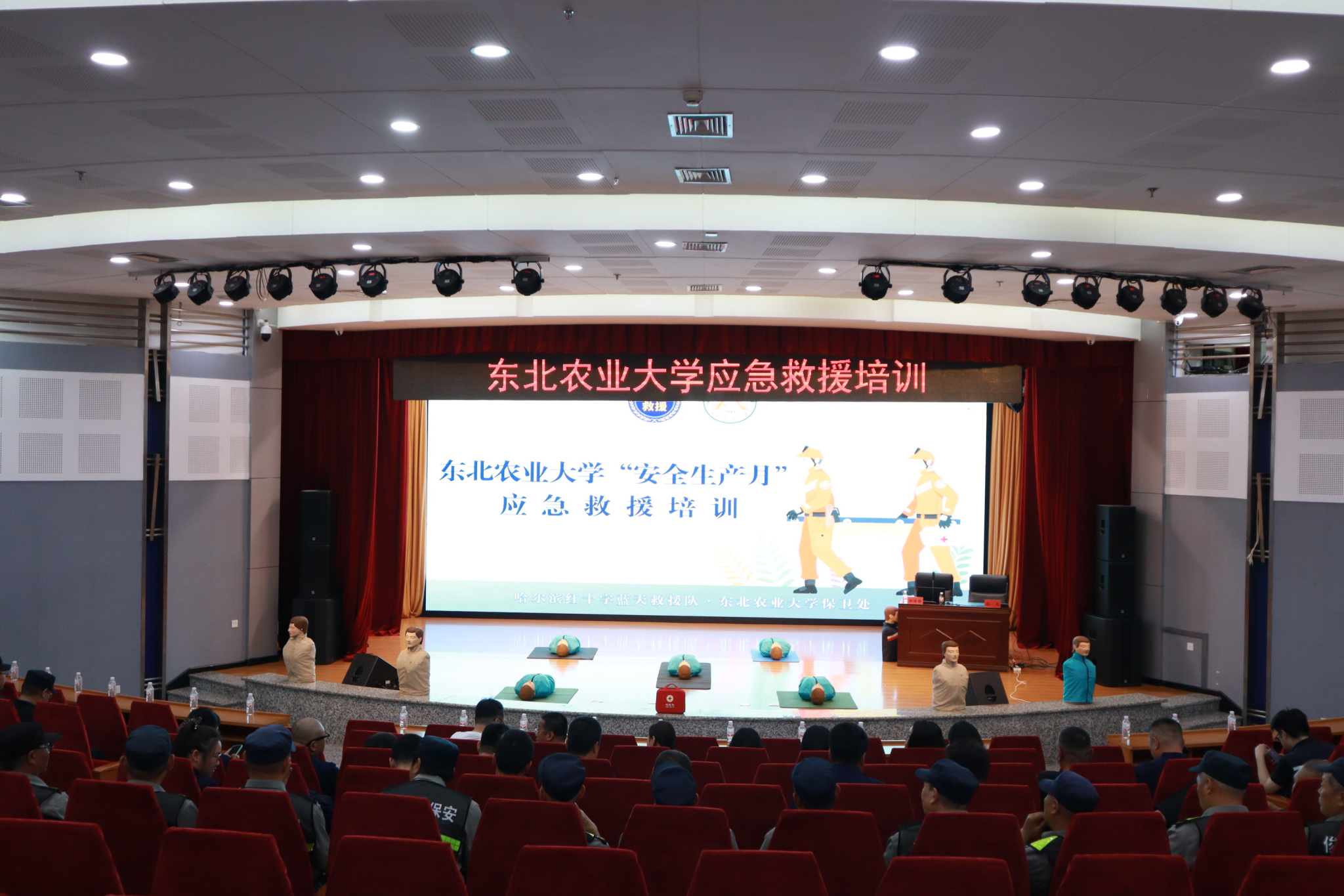 为贯彻落实《东北农业大学学习培训三年行动(2023-2025年)实施方案》《东北农业大学强化管理三年行动(2023-2025年)实施方案》工作要求,进一步开展学校“安全生产月”活动,提升校园安全基础防控和突发事件应急处置能力,6月14日上午,保卫处邀请到哈尔滨红十字蓝天救援队副队长王俊刚及队员、哈尔滨医科大学附属肿瘤医院主管护师郝博雅为大家做心肺复苏(CPR+AED)培训。保卫处、实验室管理处、保安公司全体成员参加此次培训会。会议由保卫处副处长陈亮主持。