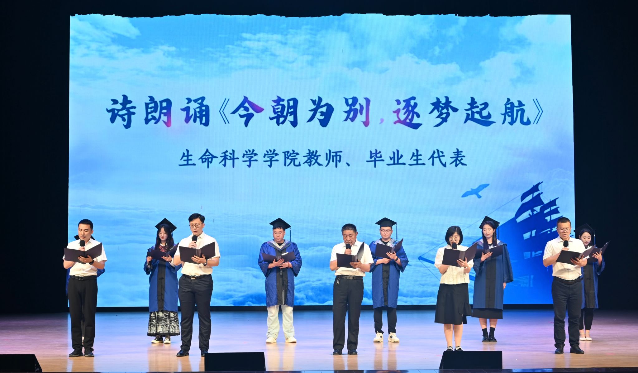 南屏山上的晚钟声,牵动着千里之外的心,校合唱团为即将奔赴山海的毕业生们送上了母校的祝福与惦念。学院舞蹈队用动感舞姿诠释着对未来的无限向往。双宝、吴云舟、纪巍、颜廷胜、胡超五位教师和毕业硕士研究生代表带来的诗朗诵《今朝为别 筑梦起航》,寄托着老师对同学们的深深祝福与殷切期望,莘莘学子在字里行间述说着对母校和恩师的感激与不舍之情。旋律响起,梦想的风帆再次起航,毕业班辅导员韩宗伯与毕业生代表用《送你一朵小红花》传递温暖与希望,道出了师生间的浓浓情意。