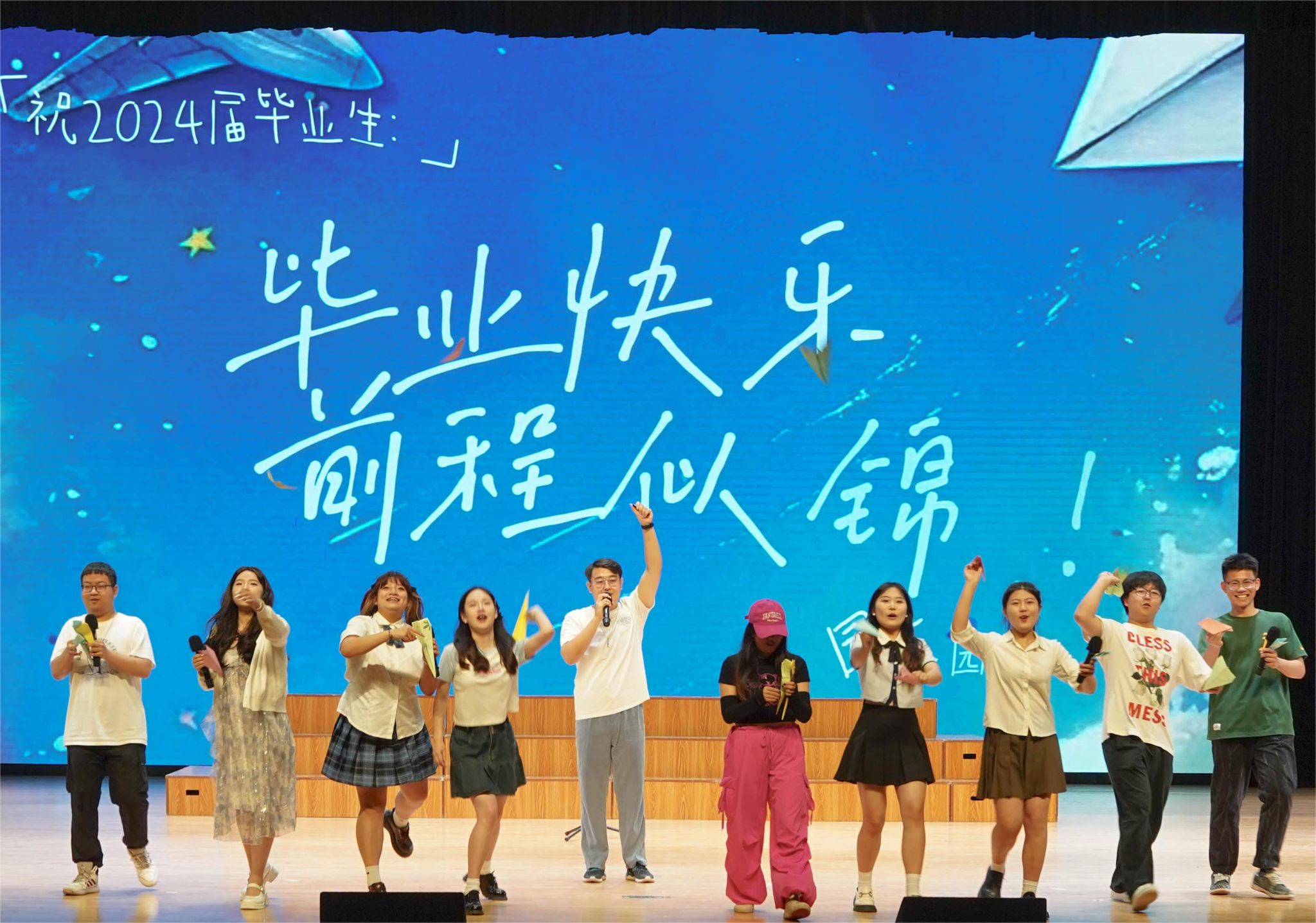 歌曲联唱《我们的大学时光》分友情、梦想、未来三个篇章表达毕业生对大学生活的不舍、对梦想的执着以及对未来的憧憬。在歌曲《我的纸飞机》演唱过程中,一个个承载着学院全体教师和学弟学妹们祝福的纸飞机飞向毕业生们,愿他们乘风破浪,前程似锦。