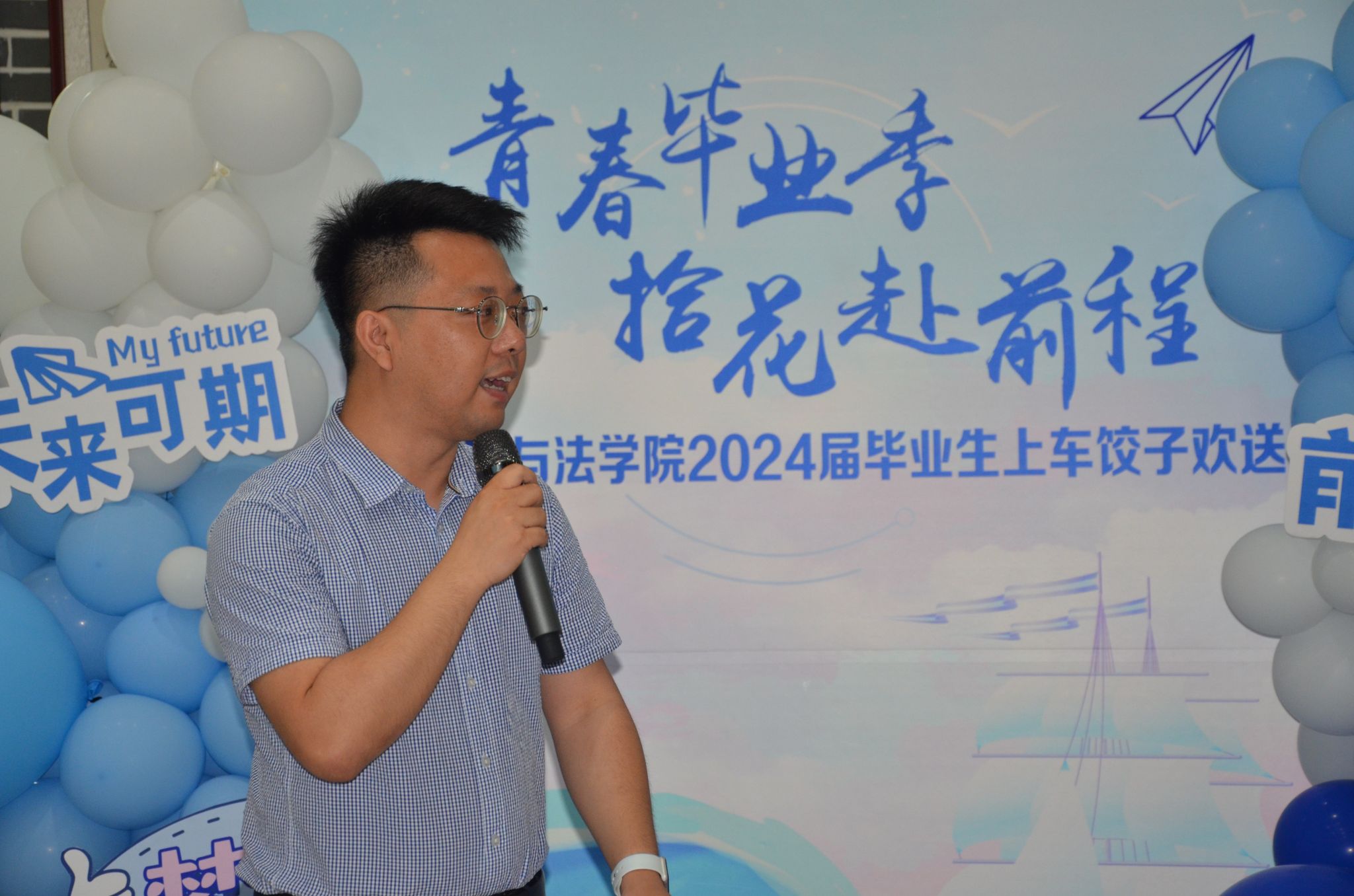毕业班辅导员王凯在寄语中表达了对2024届毕业生的依依不舍,他表示,离开校园将面临身份与角色的转换,会遇到各种挑战和压力,难免会感到迷茫、焦虑,甚至失望,希望大家耐心一些,踏实前行,所有美好定会不期而遇。