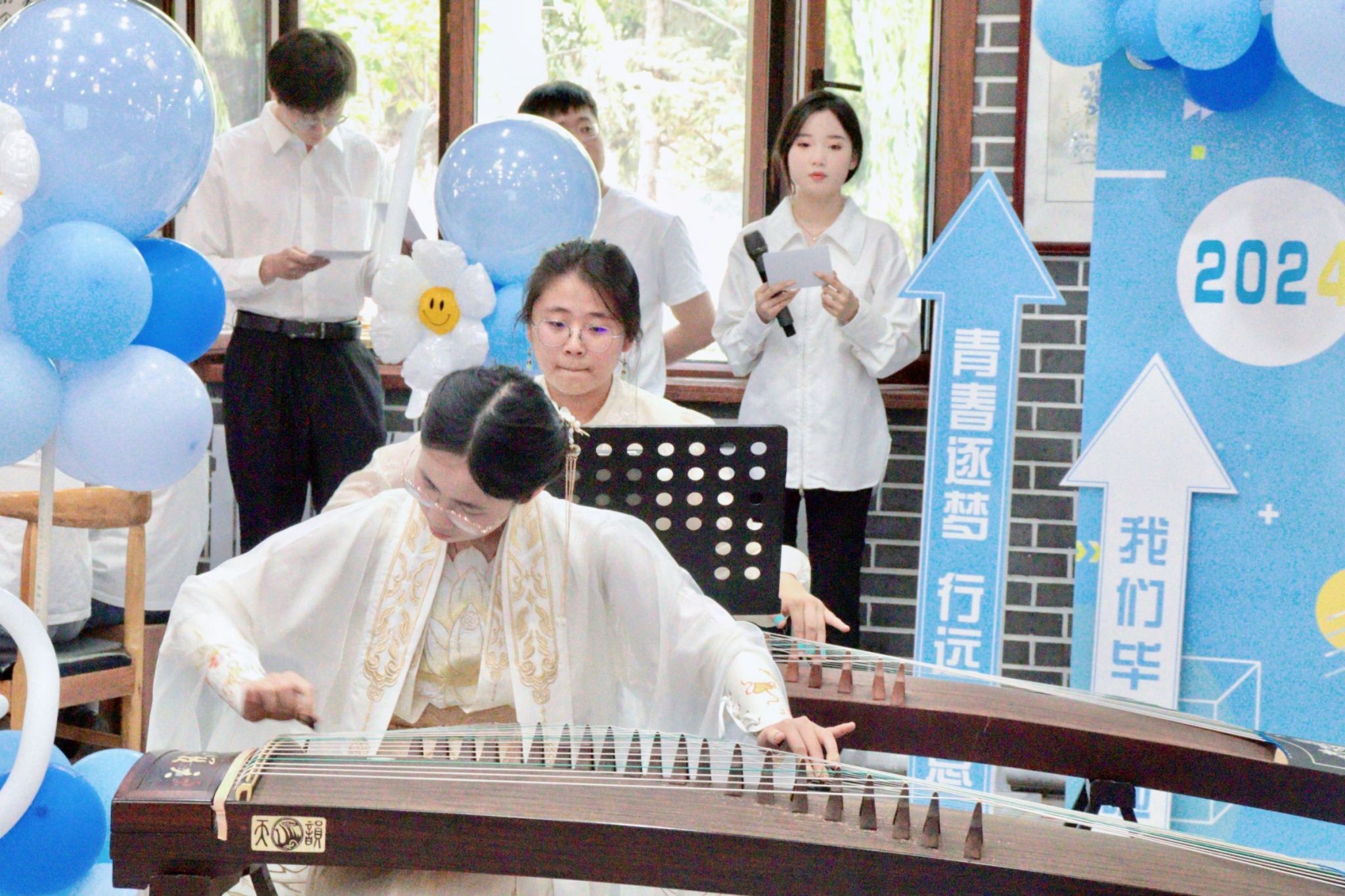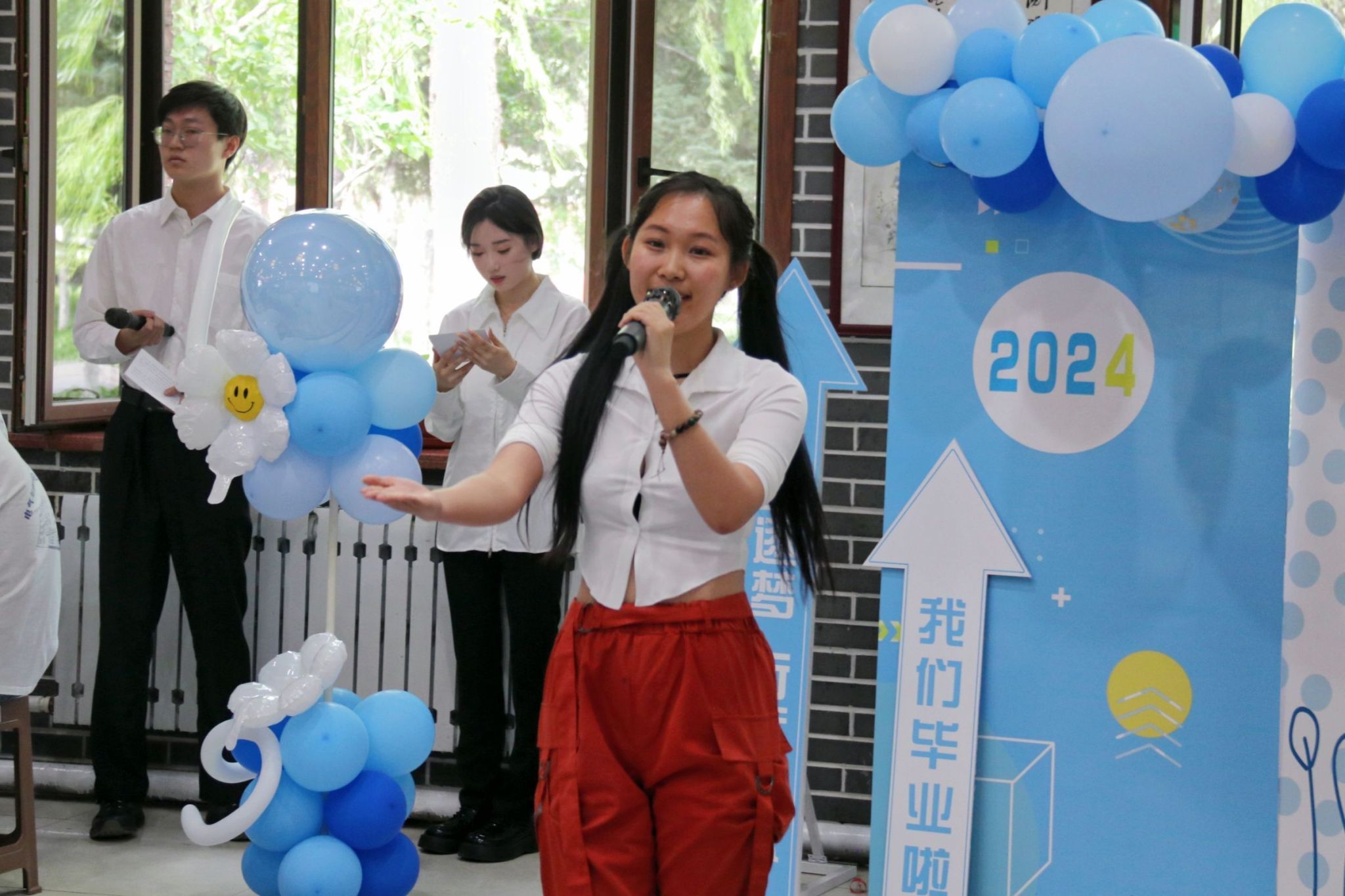 2024届毕业生余宏骏和任宪伟合唱歌曲《温柔》,陈俊宇、郭语涵带来古筝重奏《战台风》,刘志炫演唱歌曲《轻轻地告诉你》,张溪蕾与葛佳蕊献唱歌曲《遇见》,李白杨、盛怡玉献唱歌曲《最后一页》,王翰林带来魔术表演,辅导员老师合唱歌曲《栀子花开》,现场掌声连连,精彩不断。