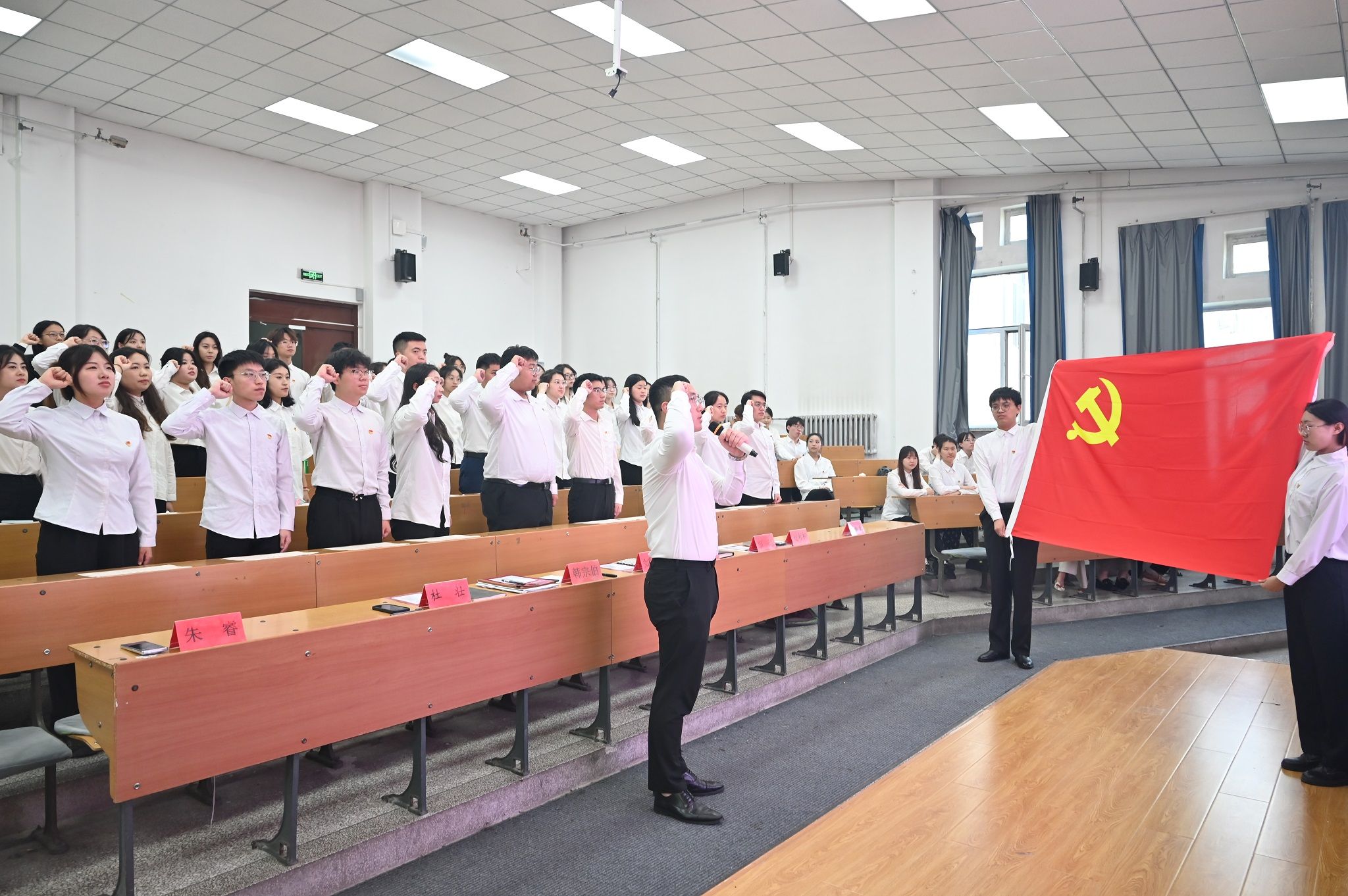 随后,辅导员韩宗伯宣读了2024年上半年新发展党员名单,辅导员赵彩桐、白舜禹为新党员代表佩戴党徽。辅导员杜壮带领全体新发展党员面向党旗庄严宣誓。