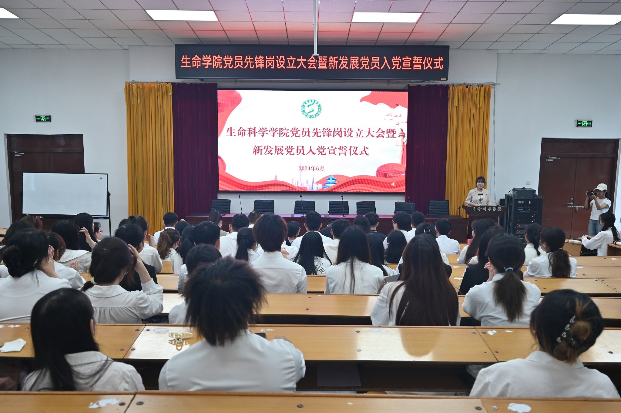 为深入学习贯彻党的二十大精神,充分发挥学生党员的先锋模范作用,激励新发展党员坚定入党初心,6月18日下午,生命科学学院在实验七报告厅举行学生党员先锋岗设立大会暨新发展党员入党宣誓仪式。学院党委副书记孙珠红、全体学生党支部书记、辅导员,新发展党员及本科、研究生党员代表出席会议。会议由学生党建中心指导教师、辅导员朱睿主持。