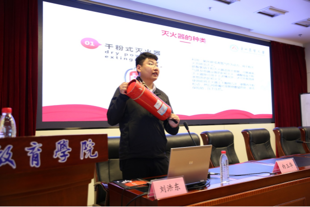 学院邀请保卫处刘浩东对教职工进行消防安全培训。刘浩东通过详细讲解、实际演示、视频警示、典型案例等方式,从基本消防安全知识、火灾逃生自救措施、消防器材使用、常见火灾预防等四个方面进行了详细讲解。会后,全体与会人员开展了消防应急疏散演练活动,保卫处杜波讲解并演示如何正确使用消防灭火器,教职工亲身体验,并掌握了对水基灭火器切断明火的实际操作流程。
