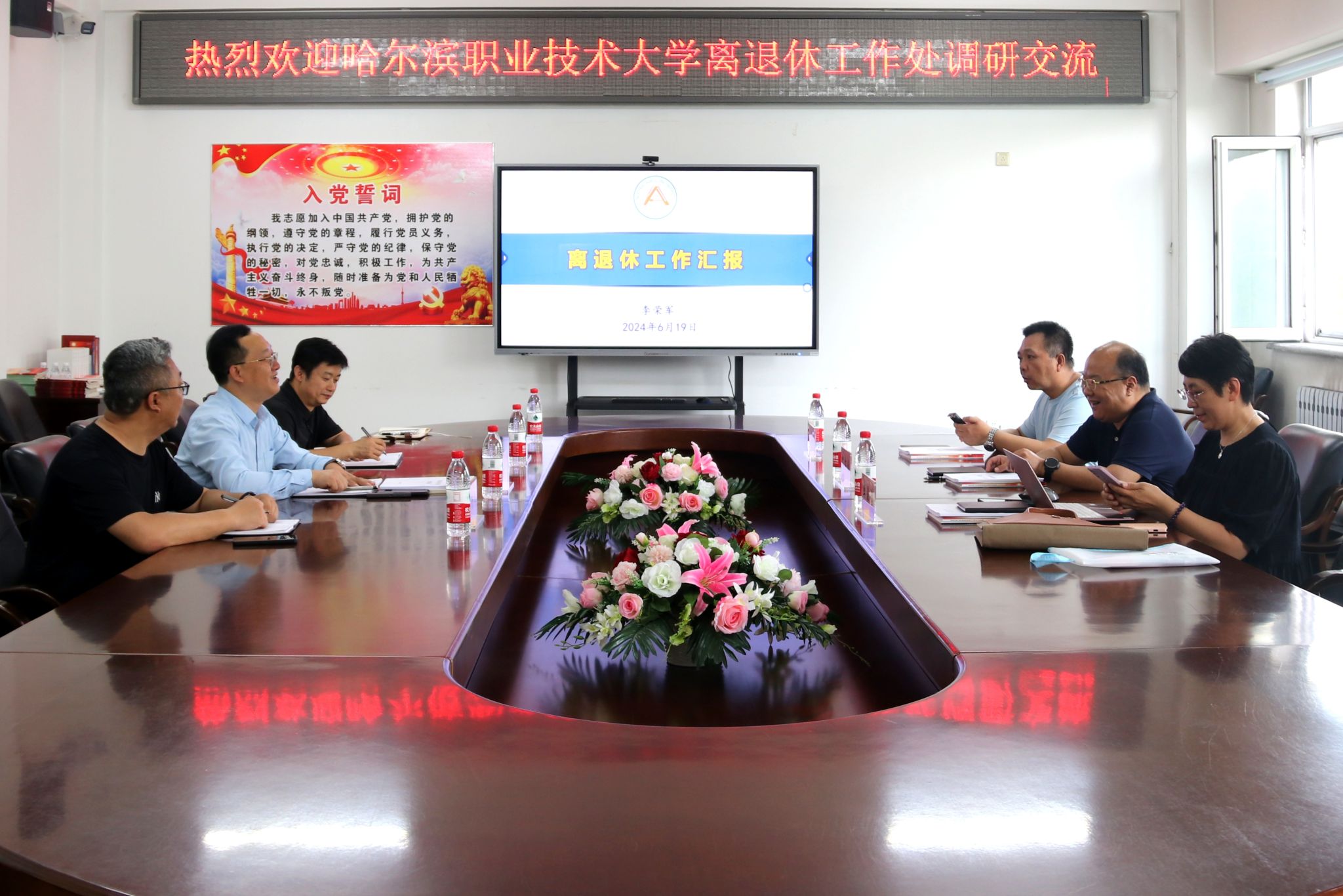 6月19日下午,哈尔滨职业技术大学离退休工作处处长孙东博,科长李晶莹及档案员赵海明一行到学校调研交流离退休工作,学校离退休工作处处长兼党委书记李荣军,副处长李晴及相关同志陪同调研。