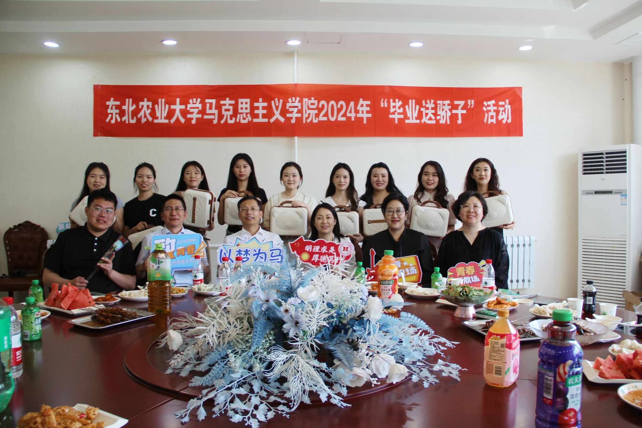 学院精心策划和筹备,为全体毕业生特别定制了精美的礼物,带有学院徽章的毕业小熊公仔、相册、箱包和帆布包,让毕业生在离开校园时感受到温暖和关怀,也让他们在未来的生活中更加自信和坚定。最后,学院领导与毕业生合影留念。毕业生们纷纷表示,无论走到哪里,都会将“明理求是,厚德笃行”的马院精神内化于心、外化于行,不断追求卓越,不断超越自我,争做新时代有理想、敢担当、能吃苦、肯奋斗的新时代好青年,用自己的实际行动为社会作出贡献,为母校争光添彩。