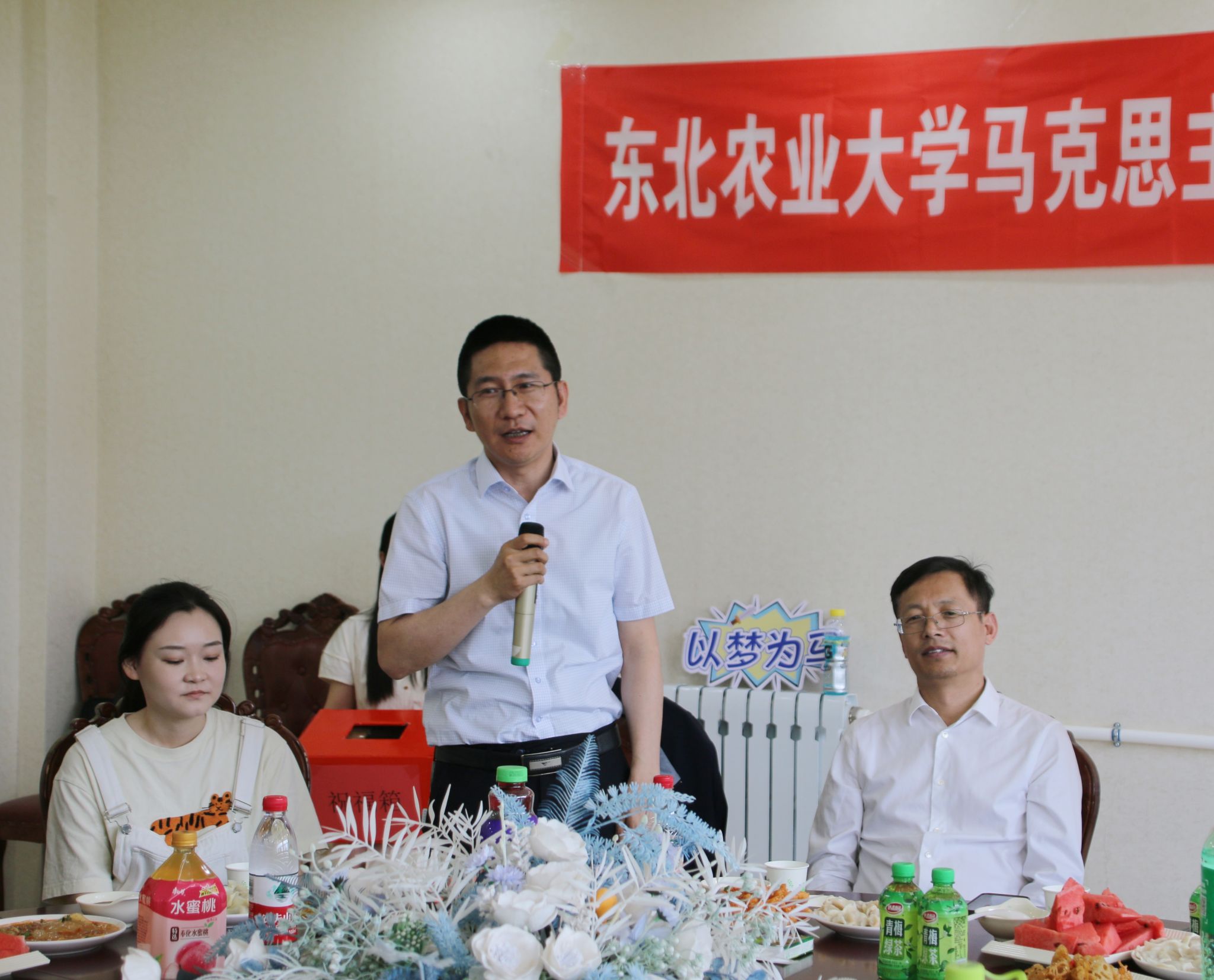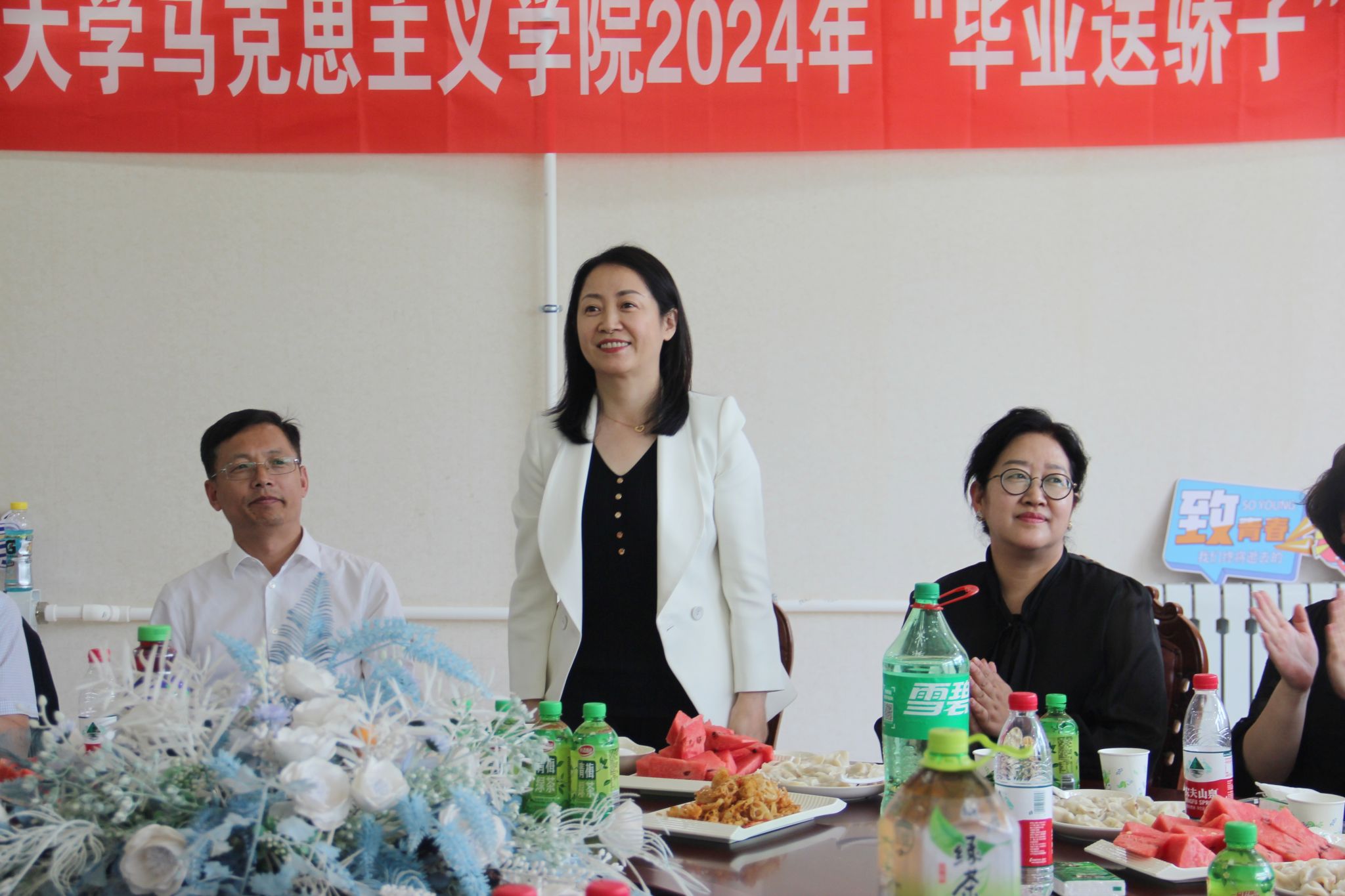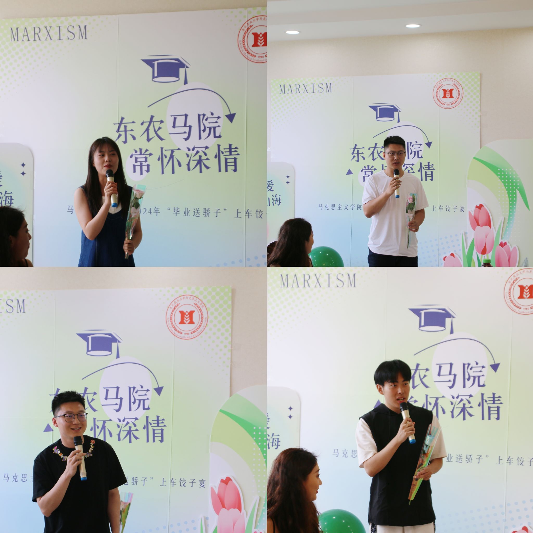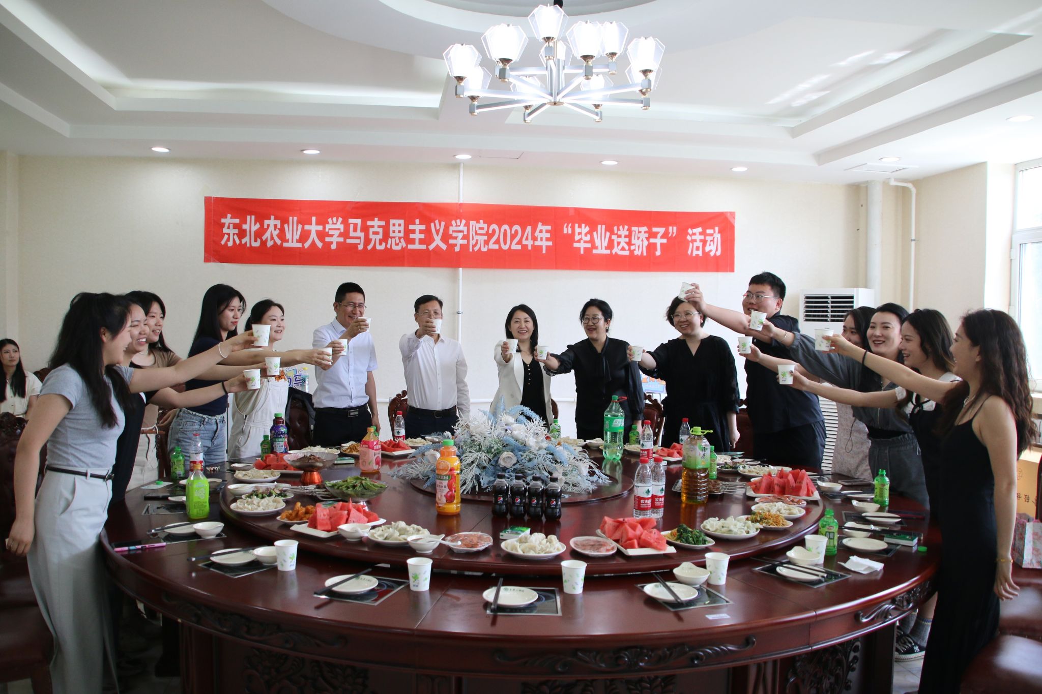 为弘扬东农精神,培养爱校情怀,营造温馨和谐的毕业氛围,抒发学子的感恩之情,表达学院的祝福与关怀,马克思主义学院于6月18日中午在南一餐厅三楼举办“惜别之情满东农·饺香浸润学子心”2024届毕业生“上车饺子”欢送活动。学院党委书记吕晶、院长许静波、副院长赵继颖、校友工作办公室副主任袁洪波、副处级辅导员李水童、学生辅导员梁大林及毕业生代表参加活动。