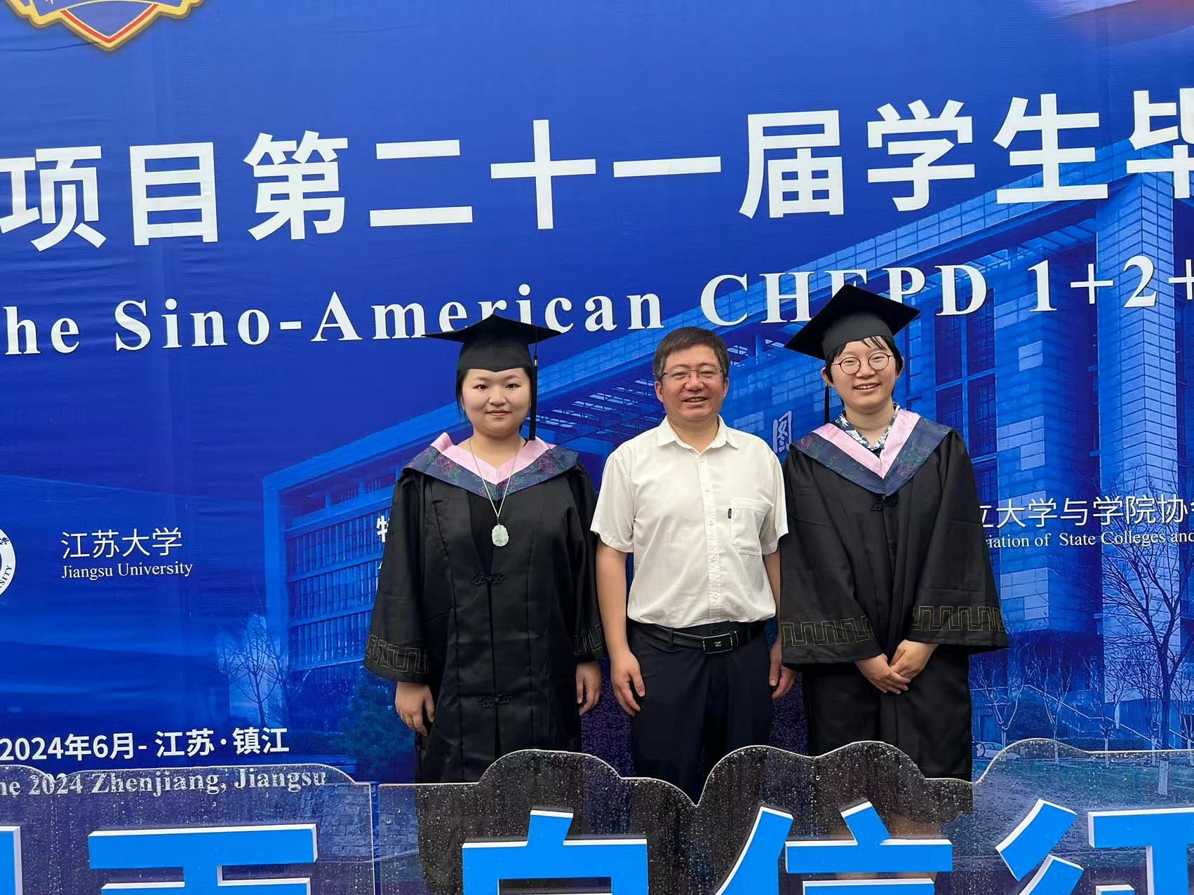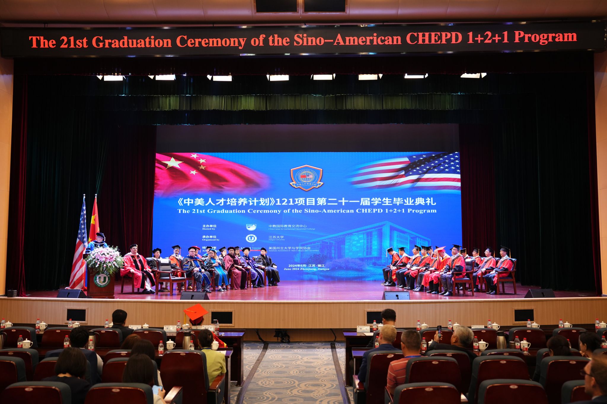 6月19日,第二十一届《中美人才培养计划》121项目毕业典礼在江苏大学礼堂举行。来自中美两国高校的80多名校长、121项目负责人、协调员以及120名毕业生和家长齐聚镇江,见证教育盛会。东北农业大学国际文化教育学院副院长胡长伟受邀参加,与美方合作学校代表一起为我校2024届中美121项目毕业生授予拨穗、颁发毕业证书和学位证书。