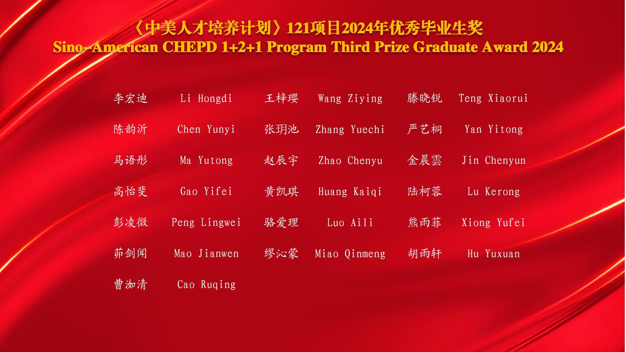 毕业典礼由江苏大学副校长邹小波主持,颁证环节由常熟理工学院副校长徐惠钢、美国塞勒姆州立大学Julie Whitlow副教务长共同主持。中美双方大学代表为第二十一届《中美人才培养计划》121项目参加典礼的120名毕业生颁发了学位证书。东北农业大学毕业生李宏迪、王梓璎获得优秀毕业生奖。