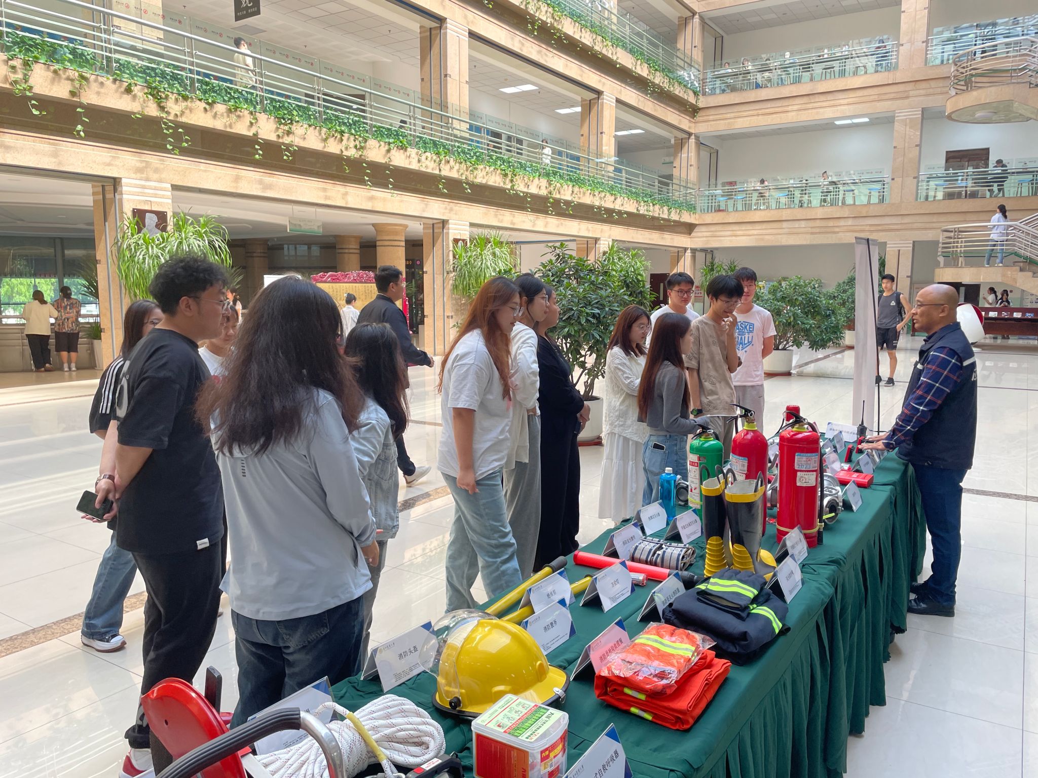 本次活动对灭火器、防火服、消火栓、空气呼吸器、破拆工具等36种不同类型的消防设备进行展览,保卫处防火科工作人员详细介绍并演示消防设备的功能和使用方法,现场师生兴致高涨,积极踊跃了解消防设备,气氛热情激昂。