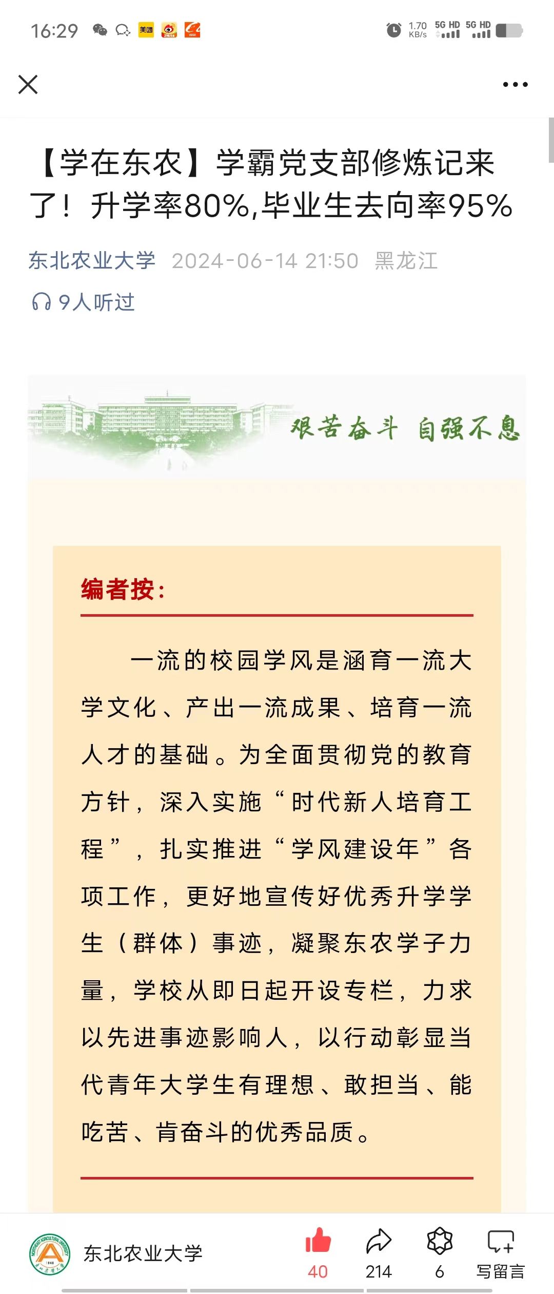 6月14日,学院毕业班志愿服务学生党支部升学率80%,毕业生去向率95%的先进事迹,被学校官微“学在东农”专栏转发报道。勤奋务实、严谨求学是党支部经过多年培育的优良学风,党支部成员充分发挥专业优势,以志愿服务实践活动为载体助力乡村振兴发展。学院党支部也将持续发挥好战斗堡垒和学生党员的旗帜先锋作用,久久为功,拓展育人广度,深化学风建设,积极探索学生党支部更加强劲的先锋作用与服务职能。